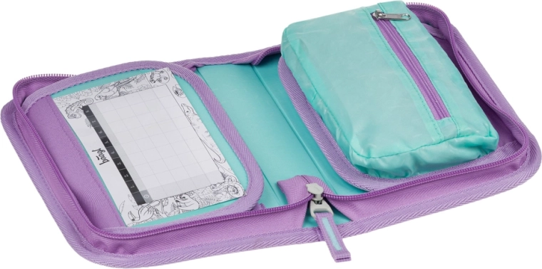 Praktična i stilska školska pernica u nježnom dizajnu Lavender brenda BAAGL oduševit će sve školarce. Nudi klasičnu jednokatnu izvedbu s dvjema preklopnim stranicama, izdržljiv YKK patentni zatvarač, prostranu unutrašnjost s džepićem za sitnice i prozorce za raspored sati. Zahvaljujući čvrstim gumicama za bojice i flomastere te mogućnosti da se pernica u potpunosti raširi, sadržaj je savršeno pregledan. Izrađena je od recikliranog materijala i isporučuje se bez punjenja.
