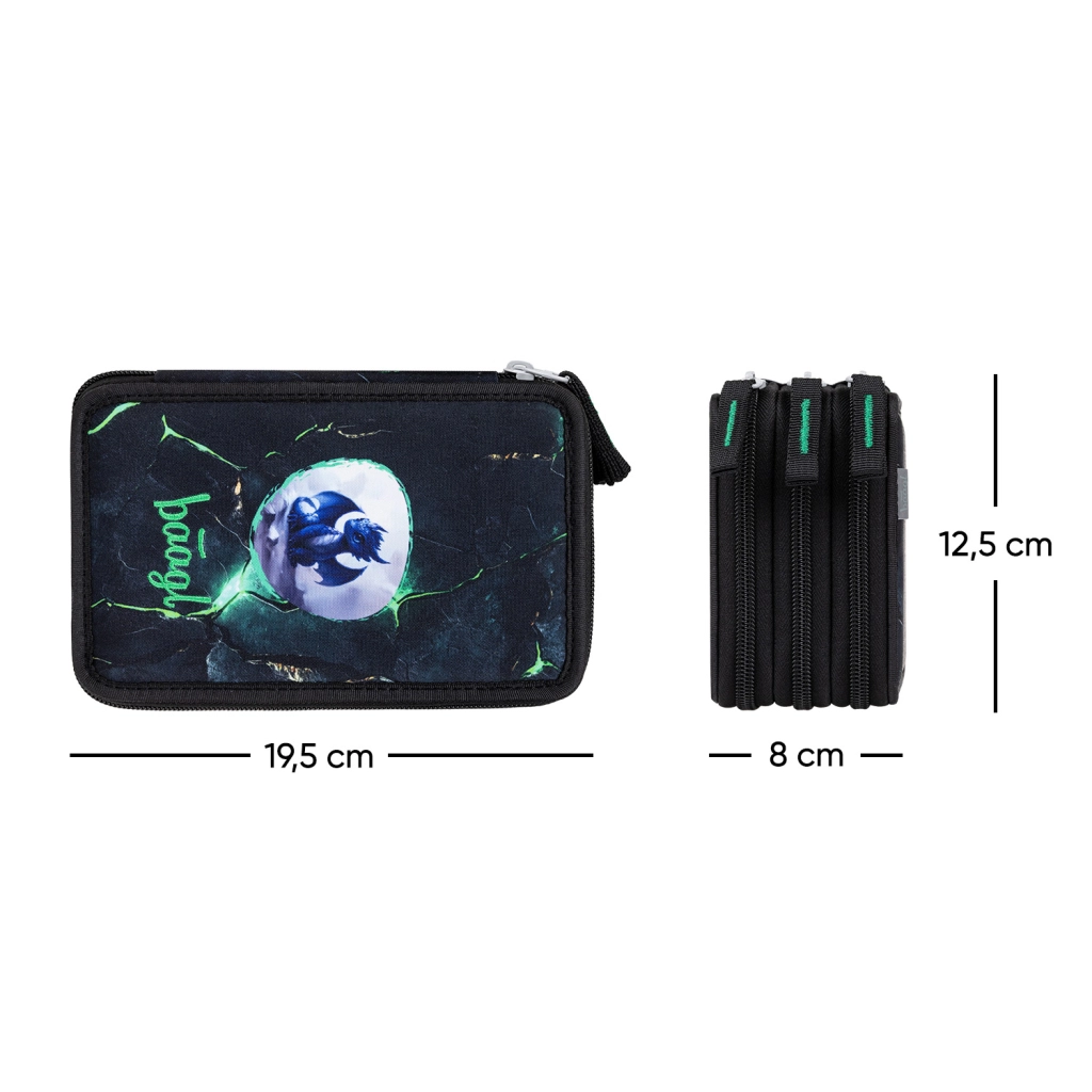 Otkrijte praktičnu i izdržljivu trodijelnu pernicu BAAGL s upečatljivim motivom zmaja. Tri odvojene komore s patentnim zatvaračima omogućuju pregledno spremanje svega što školarcu treba – od bojica i flomastera do ravnala i gumice. Brendirani YKK zatvarači i ojačana konstrukcija jamče dug vijek trajanja i pri svakodnevnoj uporabi.