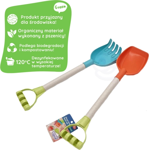 Ekološki set za pijesak WOOPIE GREEN donosi lopaticu i grablje duljine 51 cm u modernom pastelnom dizajnu. Izrađeno od organskog, biorazgradivog materijala pogodnog za kompostiranje, sigurno za djecu (dezinficirano na 120 °C). Odlično za pješčanik, plažu i vrt.
