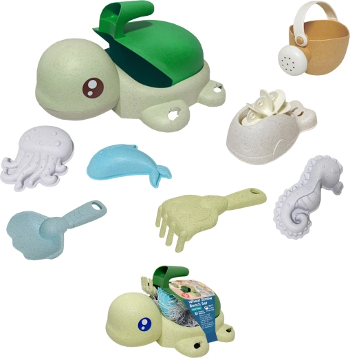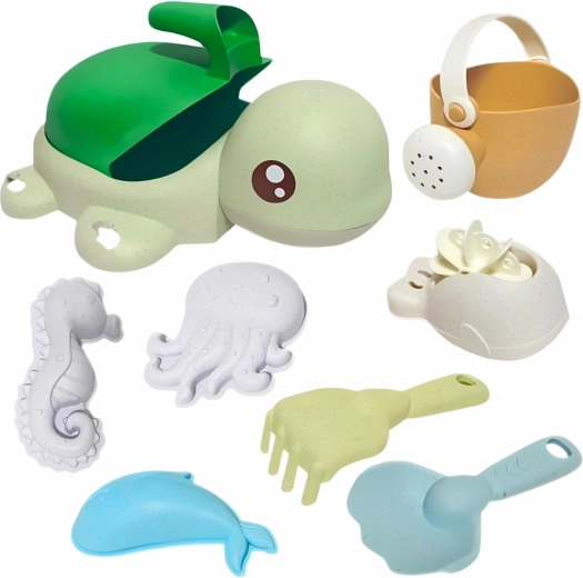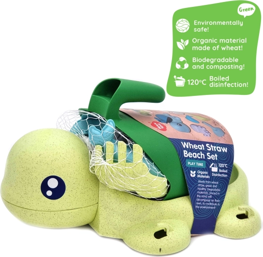 Što je u setu: kanta/kornjačica s prijanjalicama, kanta za zalijevanje, lopatica, grablje, žlica, mlinsko kolo i 3 kalupa (morski organizmi). Pastelne boje i zaobljeni oblici pogodni su i za mlađu djecu od 3 godine. Materijal je biorazgradiv i kompostabilan, pa se djeca igraju odgovorno prema prirodi.