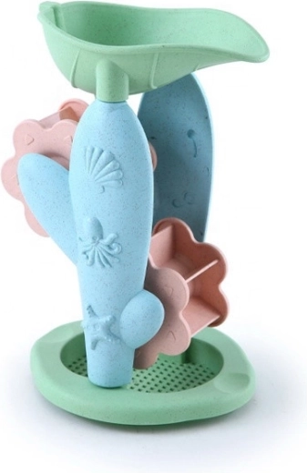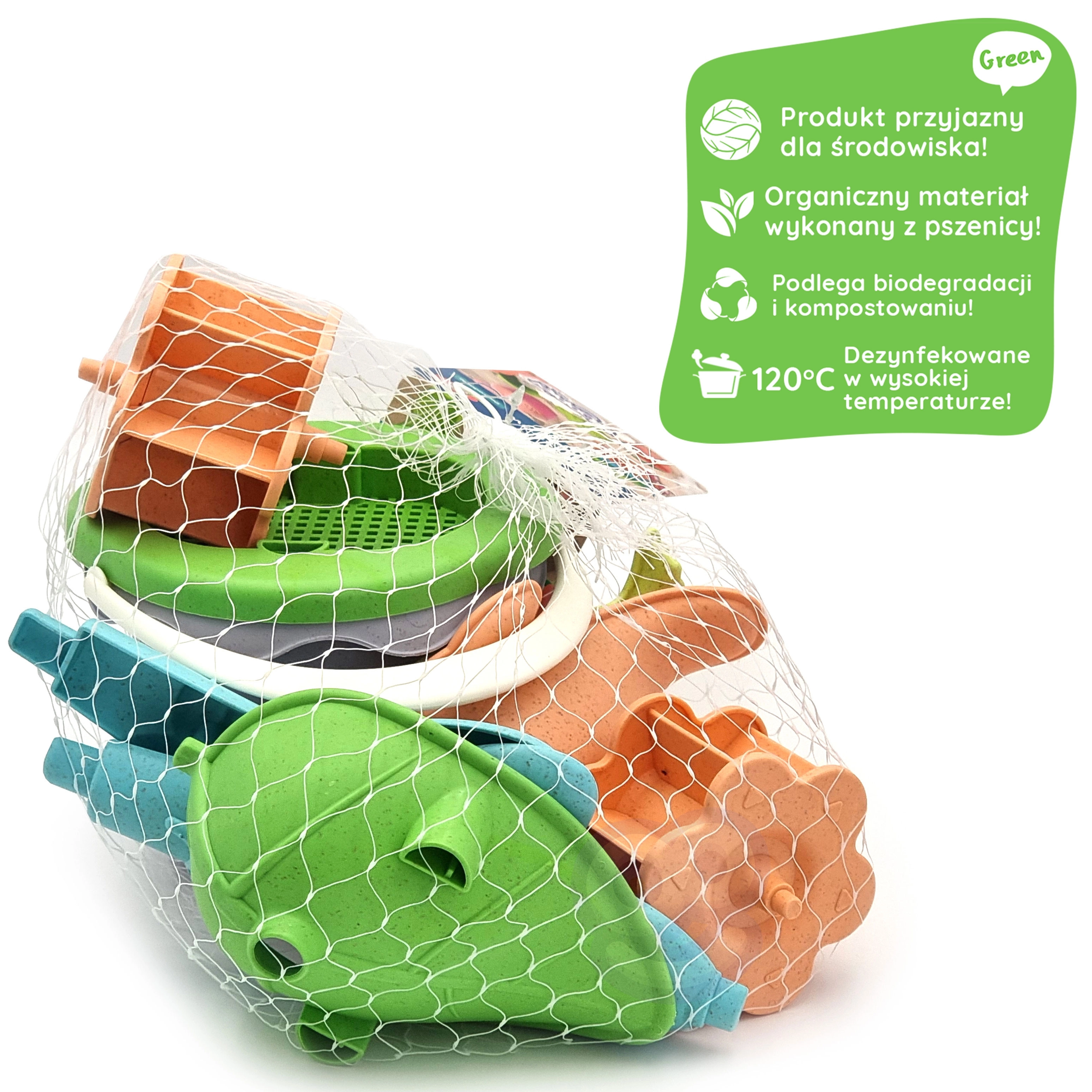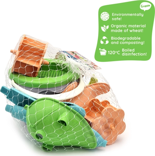 Set je izrađen od organskog, biorazgradivog materijala na biljnoj bazi, koji je kompostabilan. Glatki oblici, izdržljiva plastika i jednostavno održavanje osiguravaju sigurnu i dugotrajnu uporabu. Pastelne boje oduševit će djecu i roditelje te se odlično slažu s ostalim igračkama za plažu.