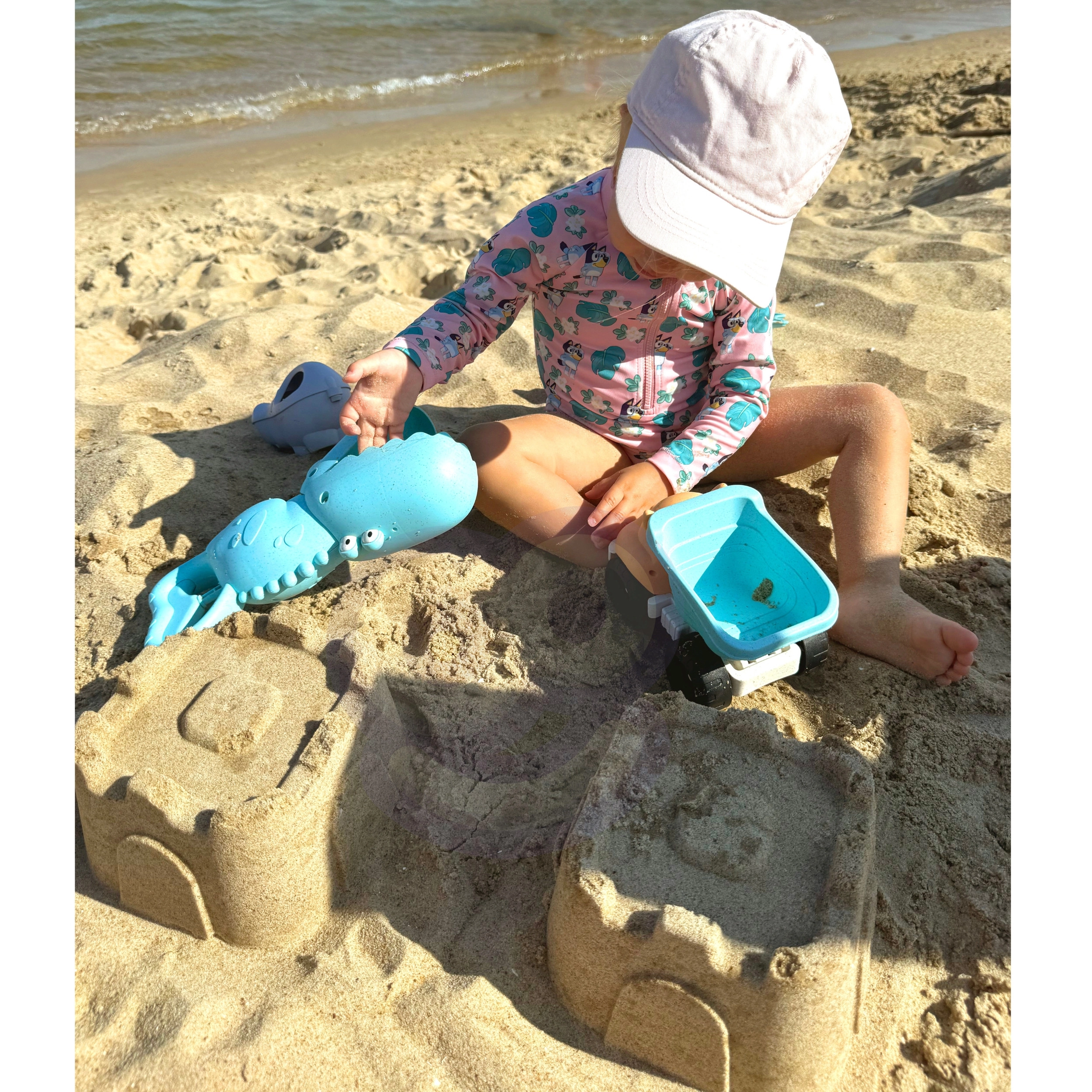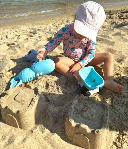 Set potiče razvoj dječje motorike, koordinacije oko–ruka, mašte i prostornog mišljenja. Zahvaljujući autiću, krokodil hvataljci i kalupima djeca grade dvorce, presipaju pijesak i voze teret. Svi dijelovi su lagani, s omiljenim oblicima životinja i prijateljskim rubovima za sigurnu igru.