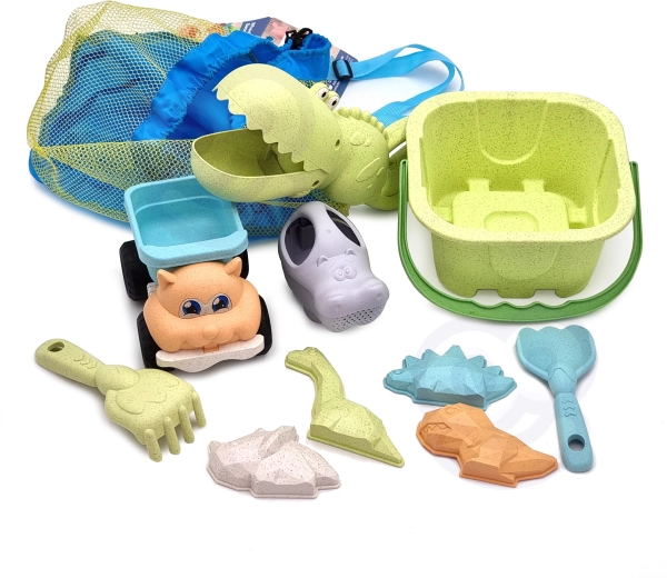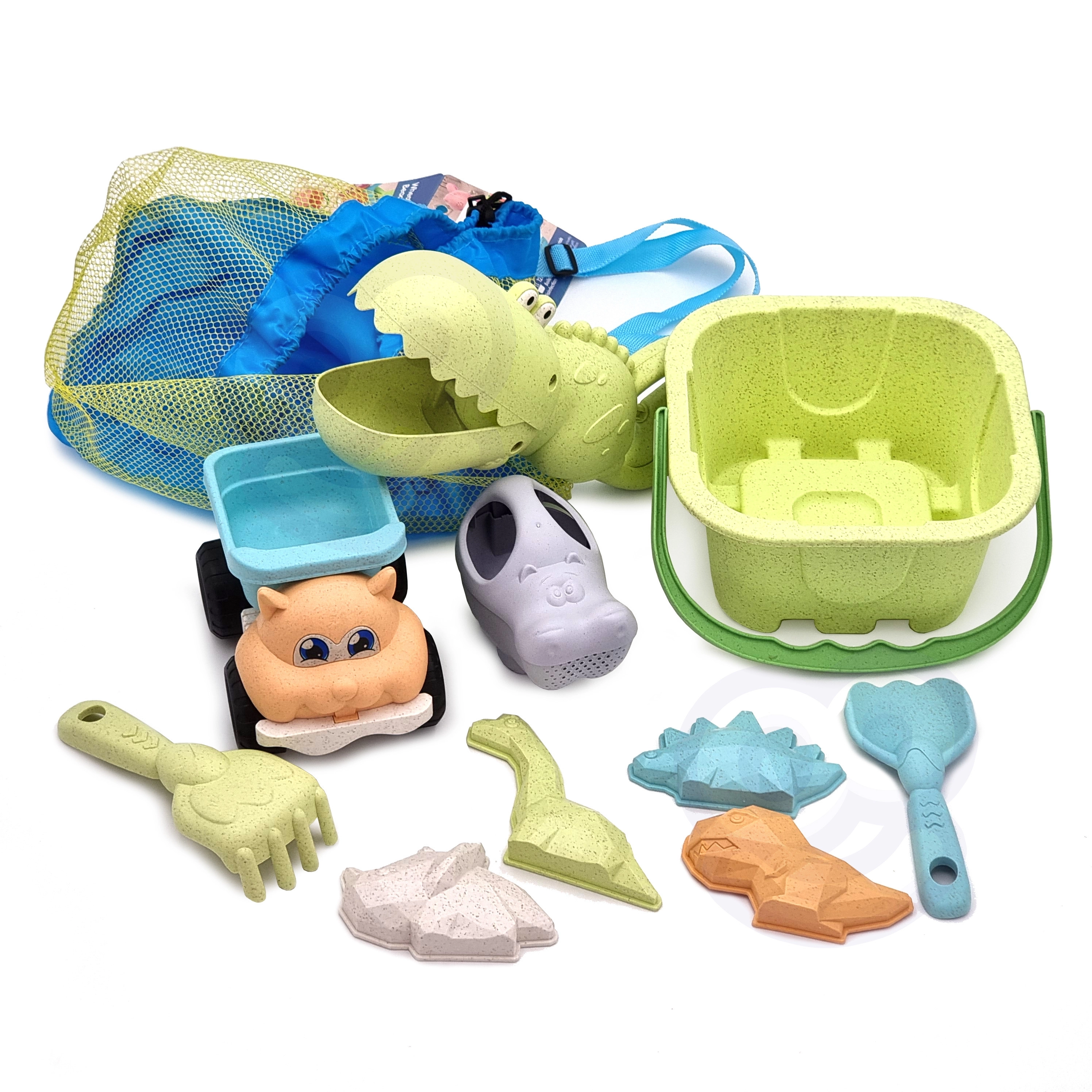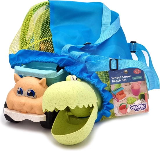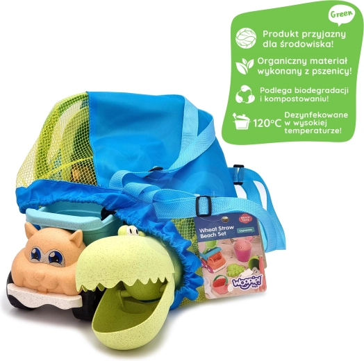 Ekološki set za pijesak WOOPIE GREEN donosi djeci sve za kreativnu igru u pijesku i uz vodu: 10 dijelova, udobnu kantu s ručkom, kanticu za zalijevanje, kalupe, krokodil lopaticu, grablje i autić. Izrađen od organskog, biorazgradivog materijala i isporučen u praktičnom ruksaku. Sigurno za djecu, dezinficirano na 120 °C, idealno za plažu, pješčanik i vrt.