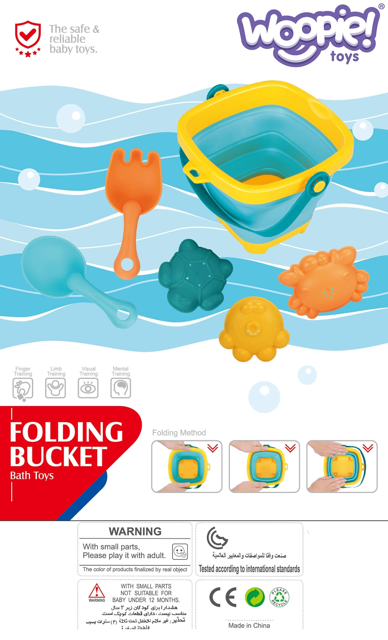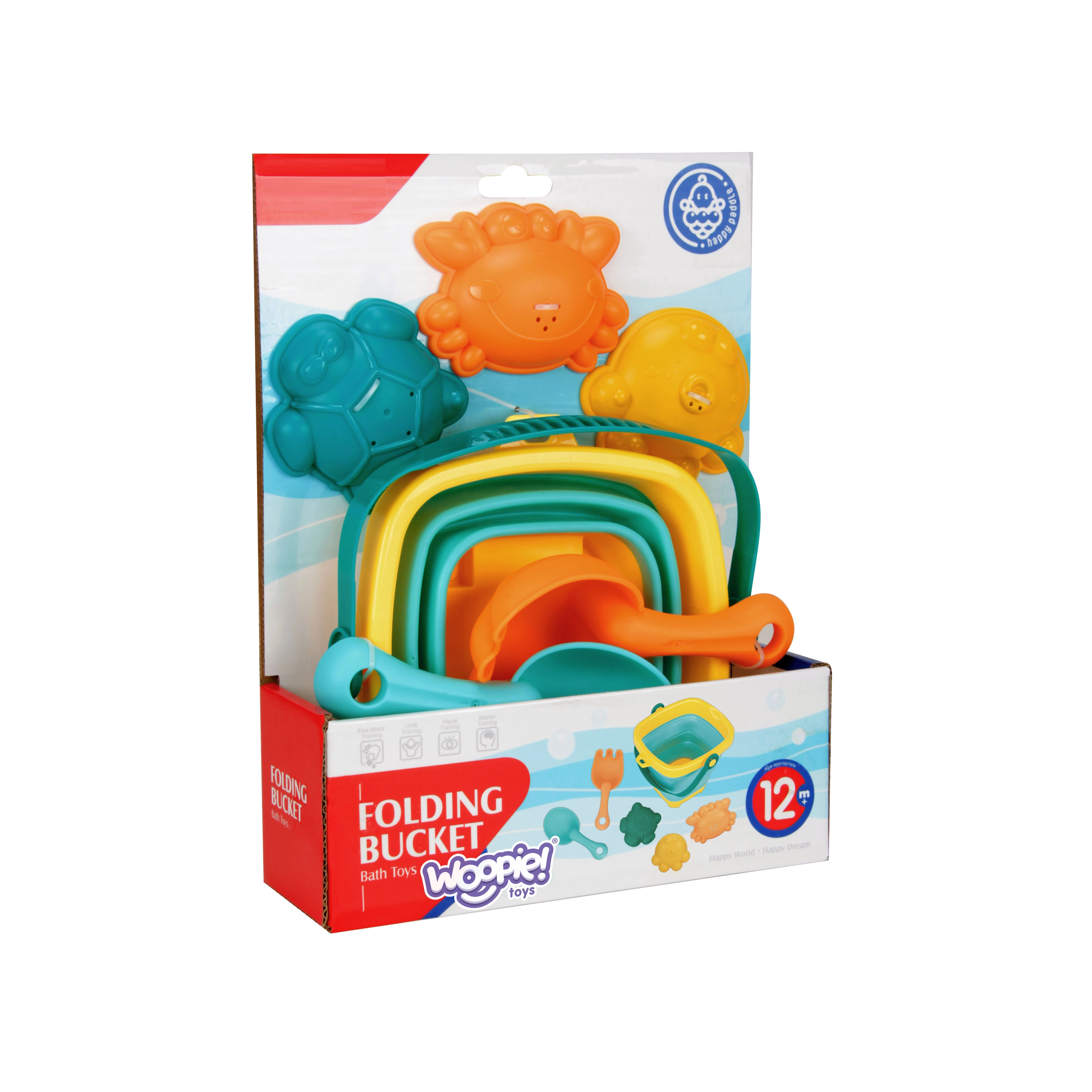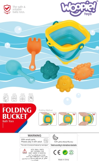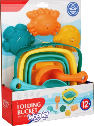 Uz ovaj šareni WOOPIE set djeca će uživati u beskrajnoj zabavi uz vodu i u pijesku. Sklopiva silikonska kanta s plastičnim rubom i dnom u trenu se spljošti u nizak oblik, pa zauzima gotovo nimalo mjesta i lako stane u svaku torbu. Elastični alati i kalupi otporniji su na pucanje i udobni za male dječje ruke.