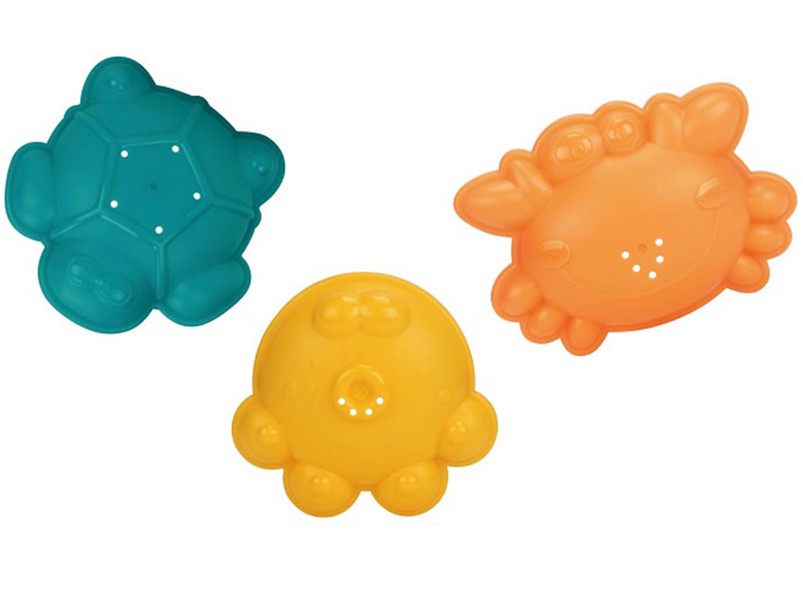 Tri šarena kalupa potiču maštu i stvaranje u pijesku i vodi. Djeca lako oblikuju kornjaču, raka ili hobotnicu.