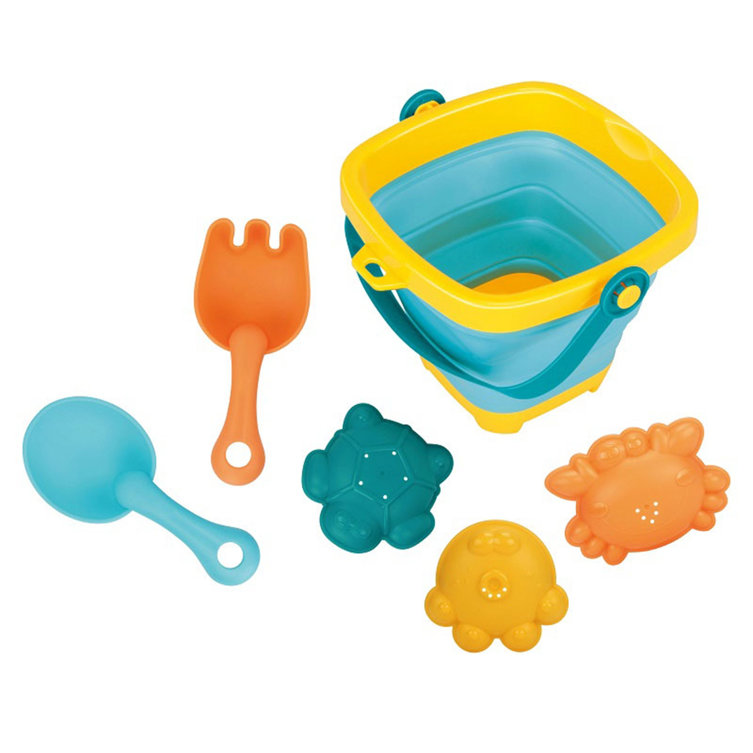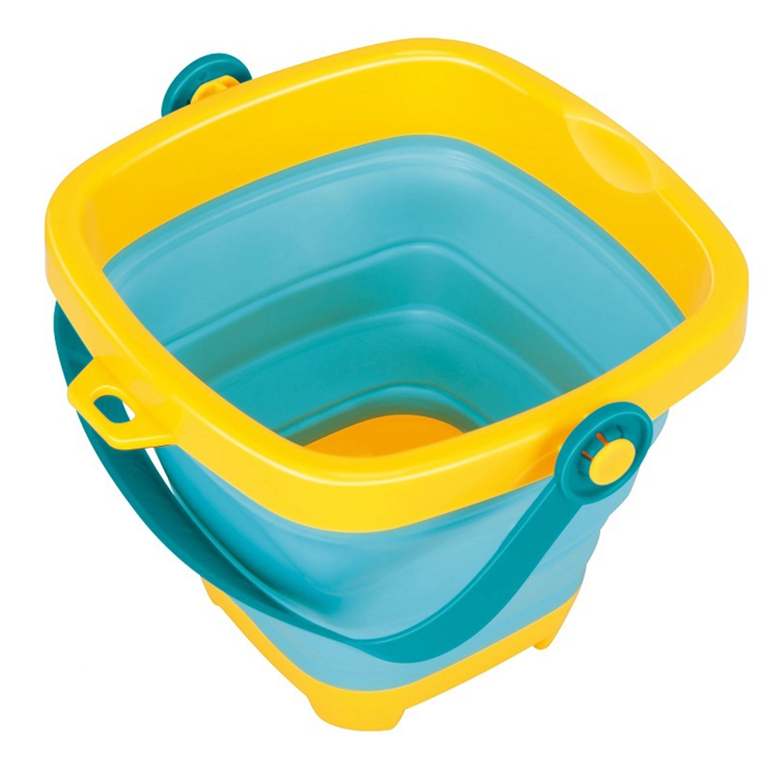 Praktičan set za pijesak i plažu za djecu od 12 mjeseci: sklopiva silikonska kanta s plastičnim rubom i ručkom, lopatica, grabljice i tri kalupa. Zahvaljujući harmonika-sklapanju kanta štedi prostor, lako se nosi i idealna je za ruksak, dječja kolica ili plažnu torbu. Izdržljivi i elastični dijelovi izvrsni su za pješčanik, plažu i vrt.