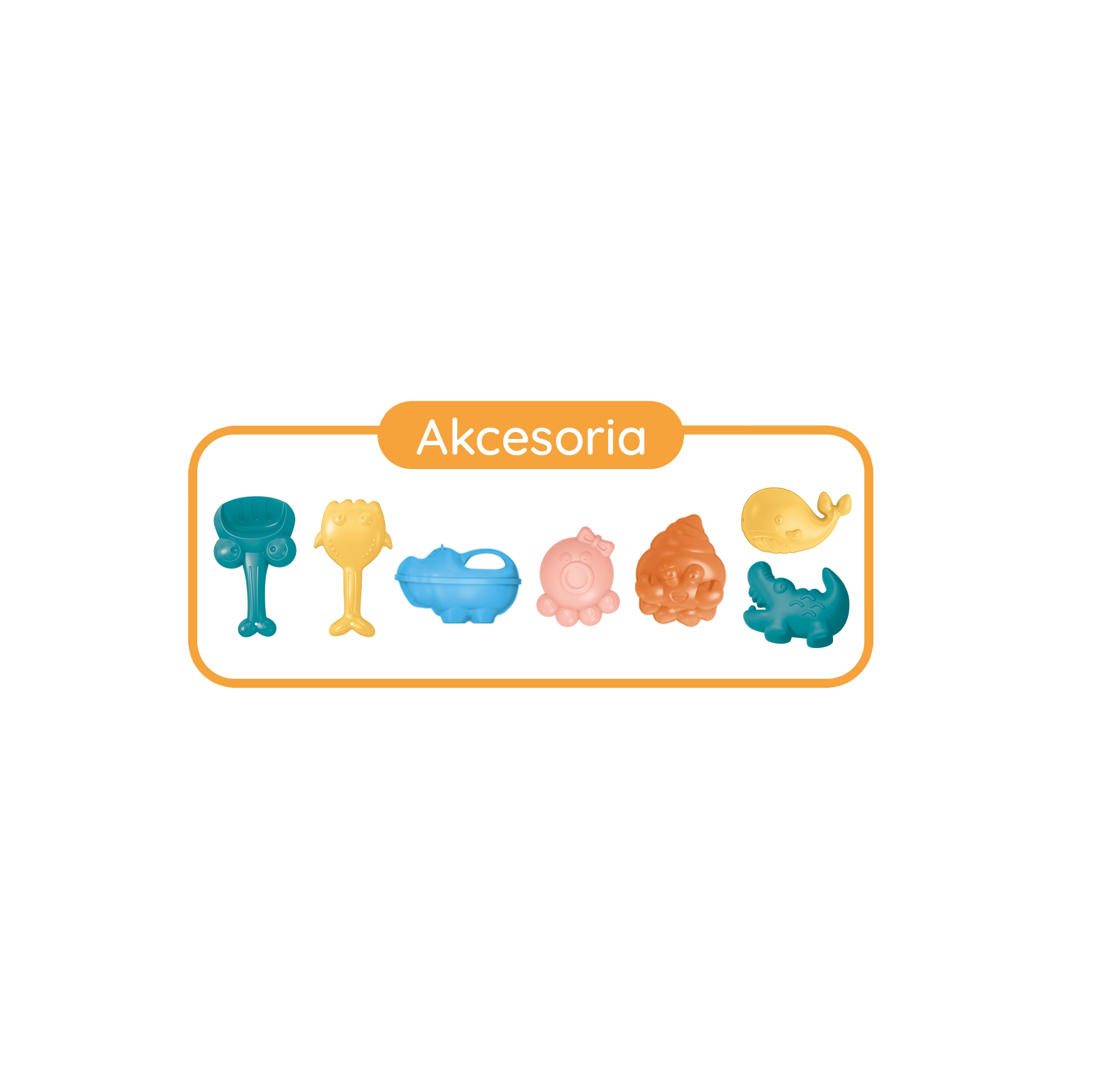 Sastavni dio su lopatice, grabljice i kalupi za potpune igre u pijesku u paru. Sve ima zaobljene oblike i žive boje koje vesele djecu i istovremeno potiču razvoj koordinacije oko–ruka. Set je namijenjen djeci od 3 godine, a zahvaljujući zatvorivom kovčežiću svi dijelovi ostaju lijepo na okupu.