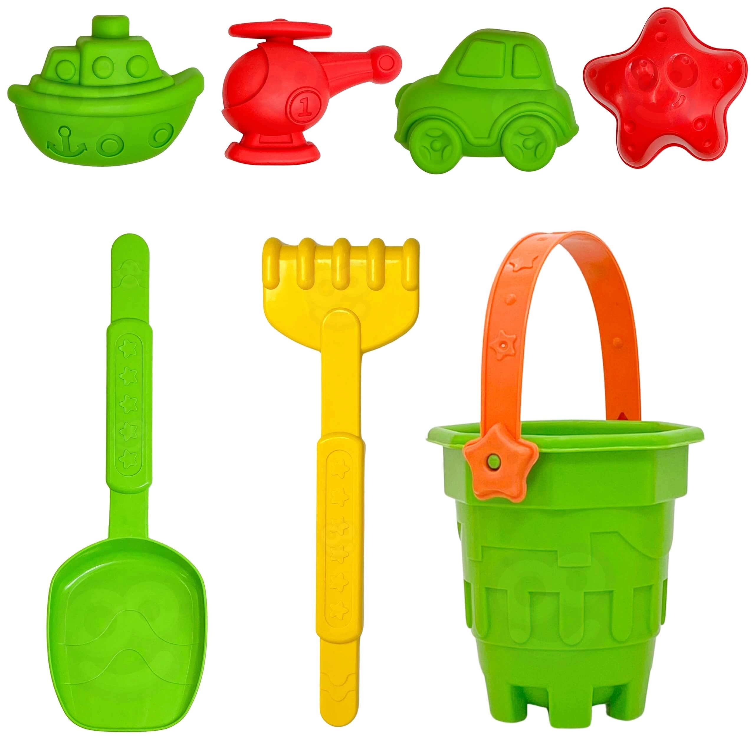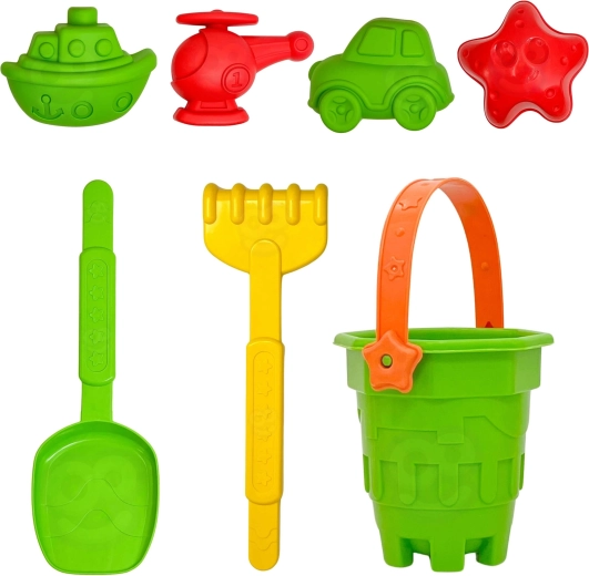 Lopatica, grablje, kanta i 4 kalupa u obliku prijevoznih sredstava i zvijezde potiču kreativnu gradnju i senzornu igru.