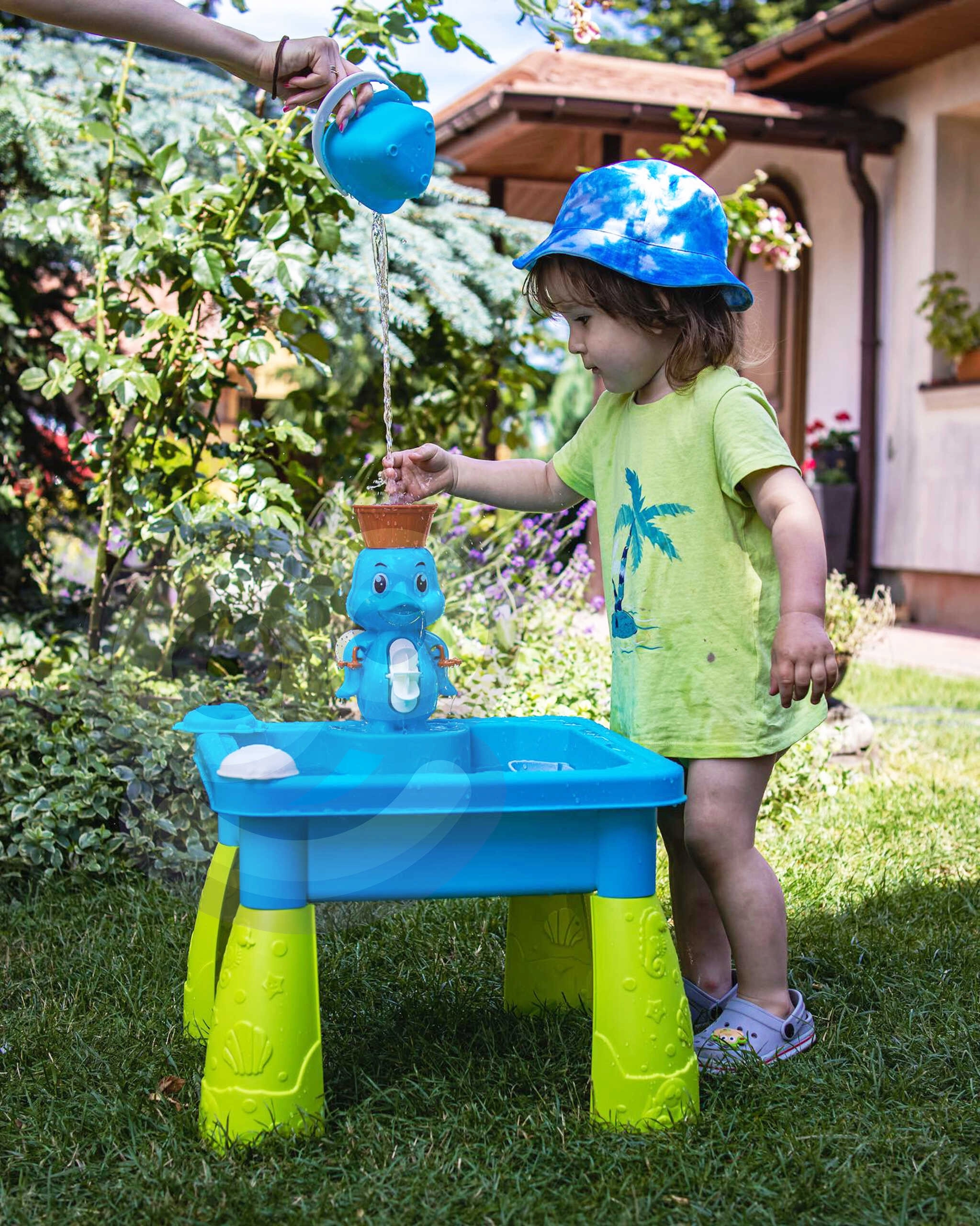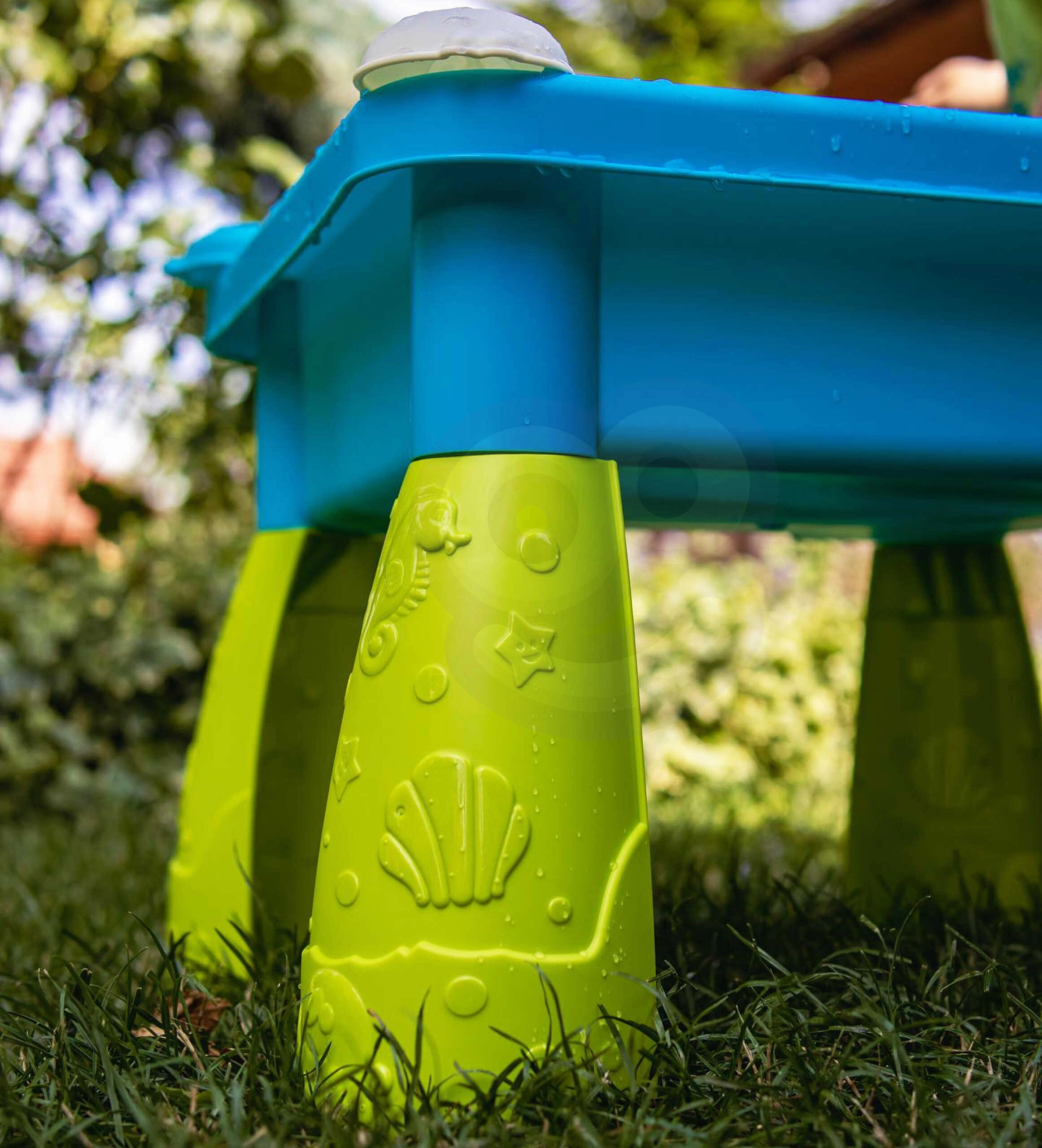 Stolić je dovoljno stabilan za igru u vrtu, na terasi ili u dječjoj sobi. Zahvaljujući bogatom setu dodataka djeca mogu zahvaćati, pretakati, oblikovati i stvarati vlastite vodene eksperimente. Jednostavna montaža i sklopiva konstrukcija olakšavaju prenošenje i pohranu.
