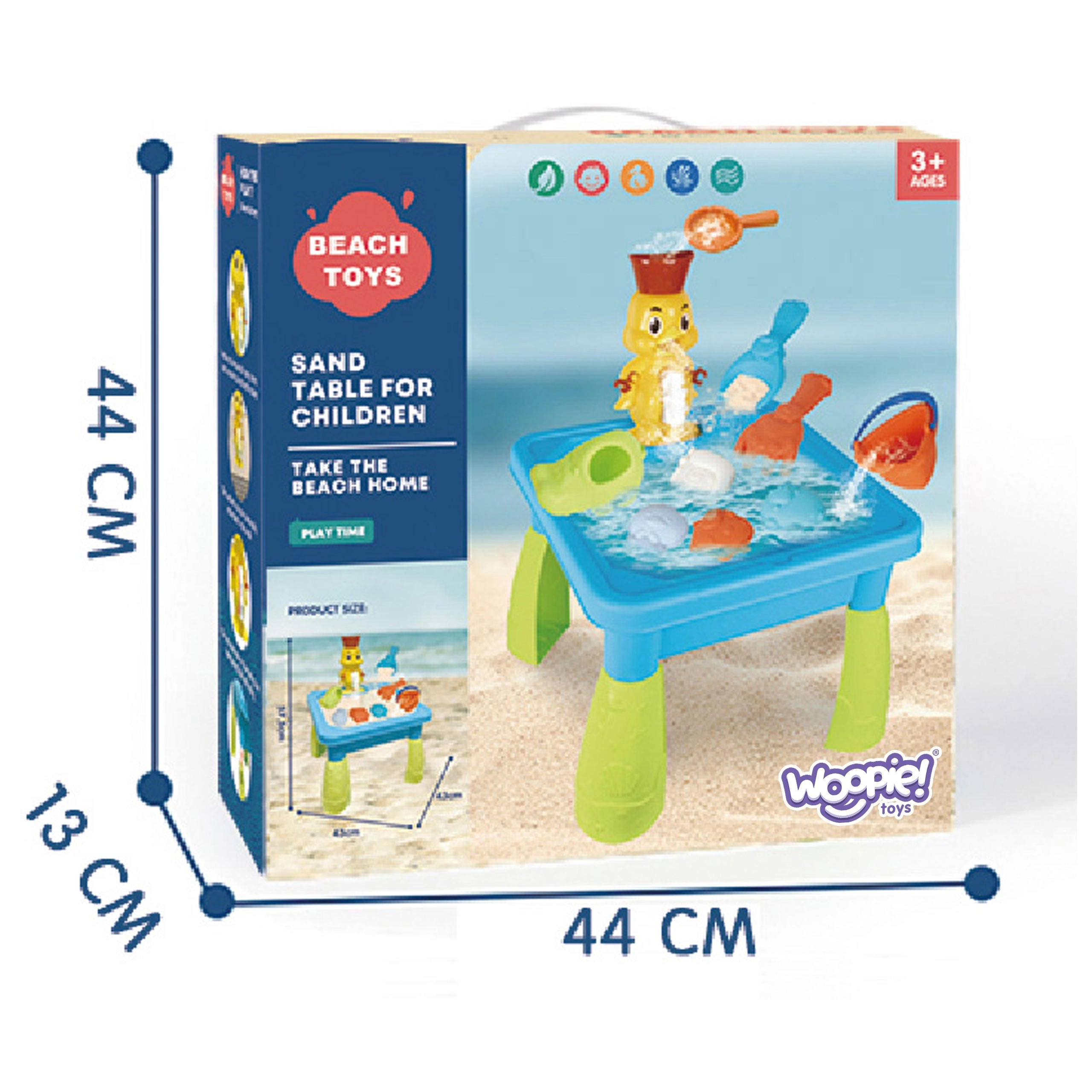 Zabavni dječji stolić 2-u-1 za igru s vodom i pijeskom marke WOOPIE donosi sate osjetilne zabave. U kompletu je slatki pačić s vodenim koljčkom i efektom vodopada, koji se zahvaljujući vakuumskim čašicama može pričvrstiti u kadi ili na zid. Set sadrži 9–10 dodataka uključujući kanticu, lopatice, grabljice i kalupe. Idealan za igru u kući i na otvorenom, lako sklapanje i montaža, prikladno od 3 godine.