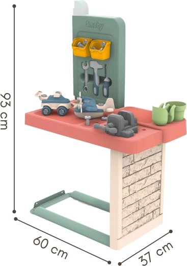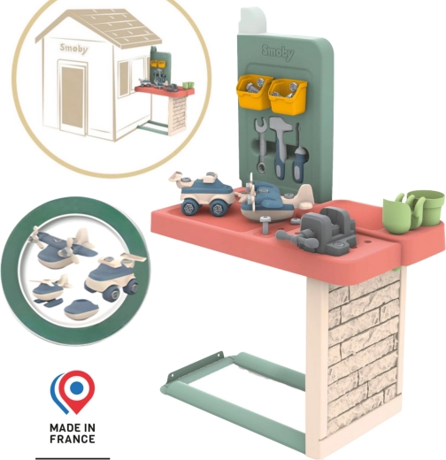 Ovaj priključni radionički stolić idealan je dodatak modularnim kućicama SMOBY Life. Zahvaljujući promišljenoj organizaciji i bogatom setu alata omogućuje djeci sigurno otkrivanje svijeta uradi-sam vještina, razvoj fine motorike, koordinacije i logičkog razmišljanja. Široka radna površina i odlagalne police drže sve na svom mjestu kako bi igra bila pregledna i zabavna.