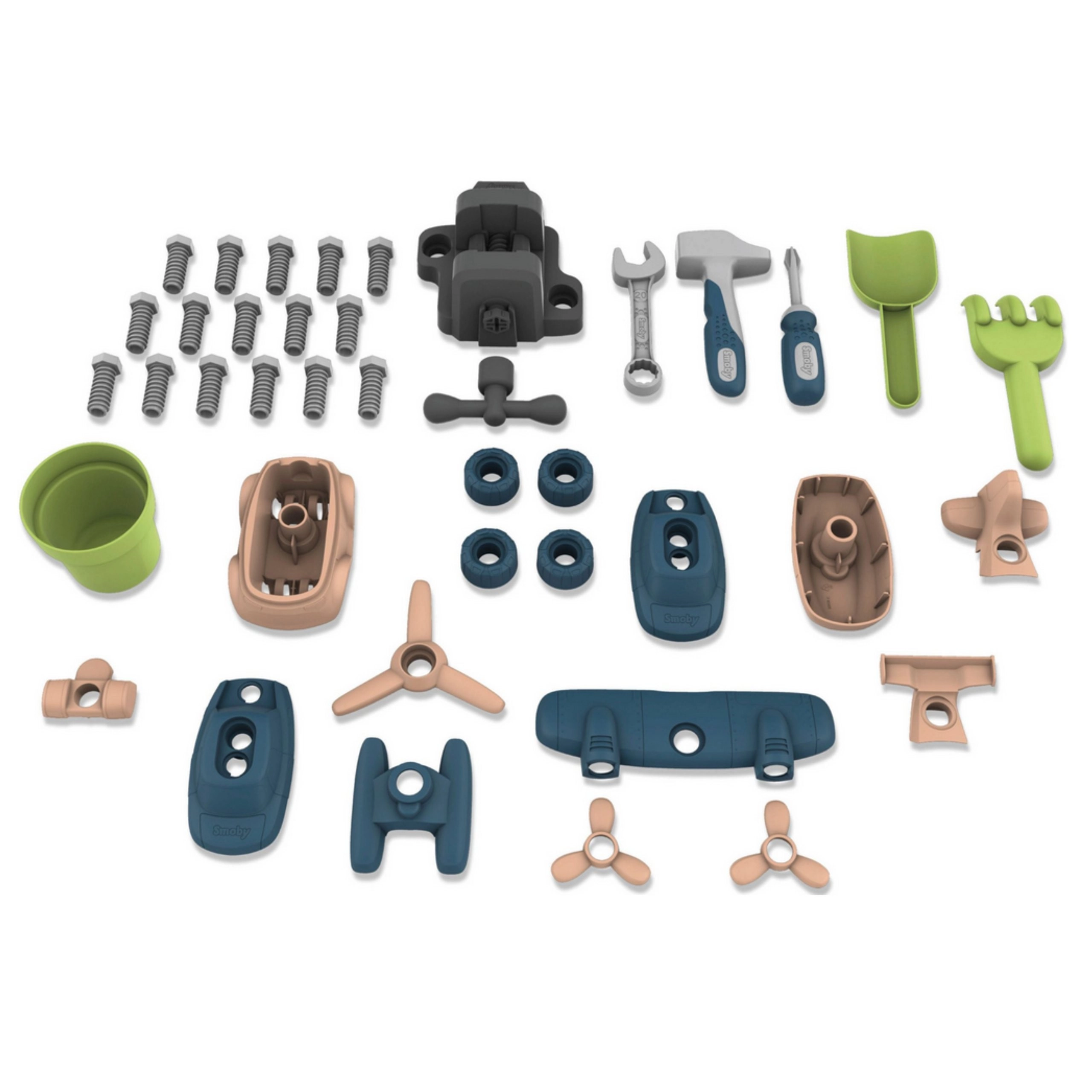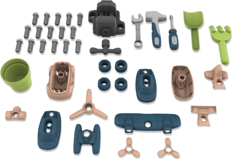Sastavni dio je 39 elemenata uključujući čekić, odvijač, ključeve i spojni materijal. Djeca mogu sama sastaviti auto i helikopter, čime vježbaju strpljenje, preciznost i osjećaj uspjeha. Materijal je izdržljiv, UV stabilan i s visokim udjelom reciklata – savršeno za dugotrajnu uporabu u vrtu i u domu.