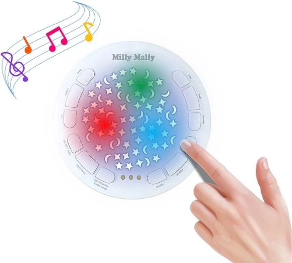 Birajte između 10 uspavanki i 5 zvukova bijelog šuma (voda i ptice, otkucaji srca, kapljice, pjev ptica, kiša). Podesite glasnoću i timer na 30/60/90 minuta.
