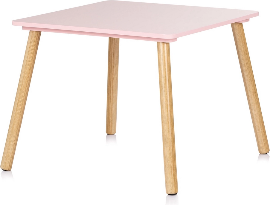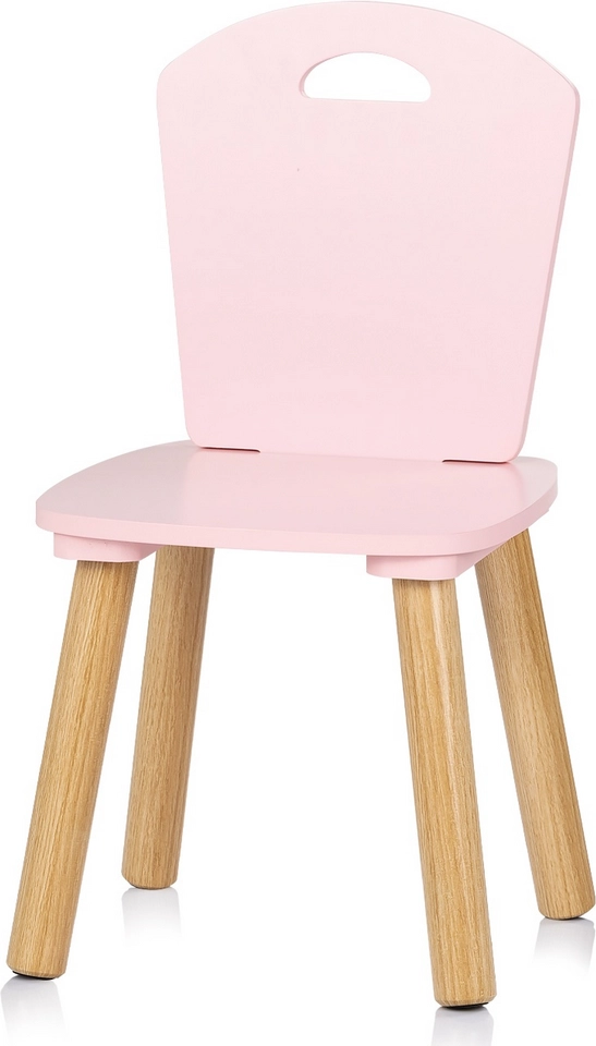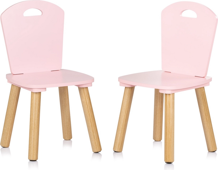 Stilski i siguran set za dječju sobu: dječji stol i dvije stolice u nježnoj ružičastoj boji s prirodnim drvenim nogama. Zaobljeni rubovi za maksimalnu sigurnost, čvrsta konstrukcija od kvalitetnog MDF-a i ergonomske dimenzije za ugodno igranje, stvaranje i prve korake u učenju.