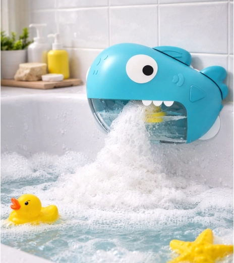 Interaktivna kupačka igračka u obliku morskog psa pretvara rutinsko pranje u radostan ritual. Dovoljno je pričvrstiti je vakuumskim čašama na glatku površinu, nadopuniti vodu s gelom za tuširanje u odvojivi spremnik i jednim pritiskom gumba pokrenuti stvaranje bogate pjene koja izlazi iz ralja morskog psa i zabavlja djecu tijekom cijelog kupanja.