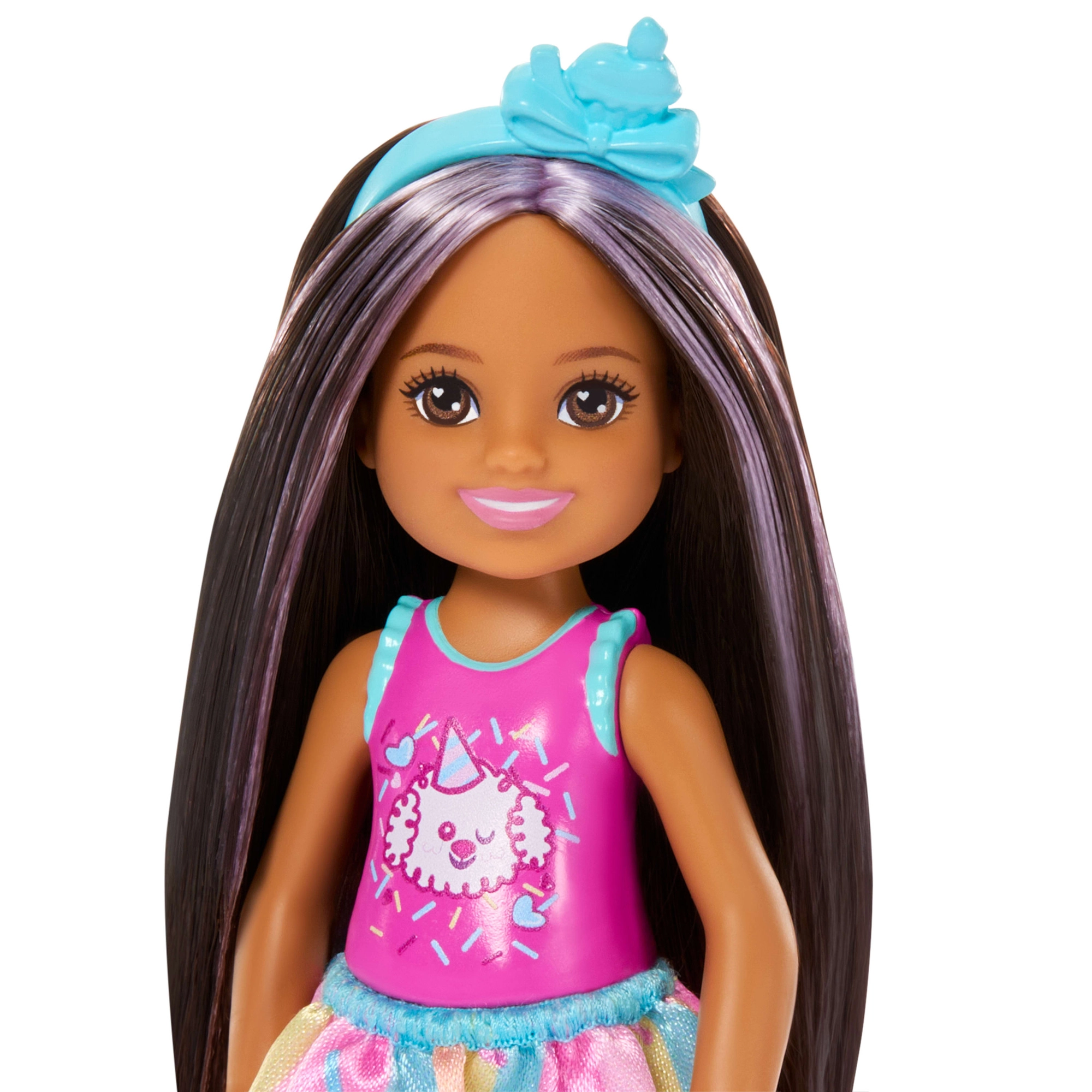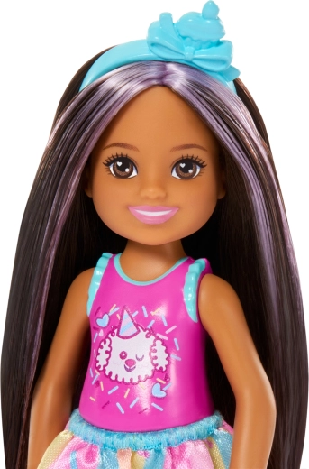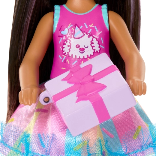 Preslatka lutka Barbie Club Chelsea donosi rođendansku zabavu u svaku igru. Malena lutka visine oko 13 cm ima dugu tamnu kosu s ljubičastim pramenovima, nosi slatki top sa psićem, šarenu suknjicu i svjetloplave sandalice. U kompletu su tematski dodaci za proslavu rođendana – balon, poklon, obruč za kosu i torta – koji potiču kreativnu igru uloga i stvaranje vlastitih priča.