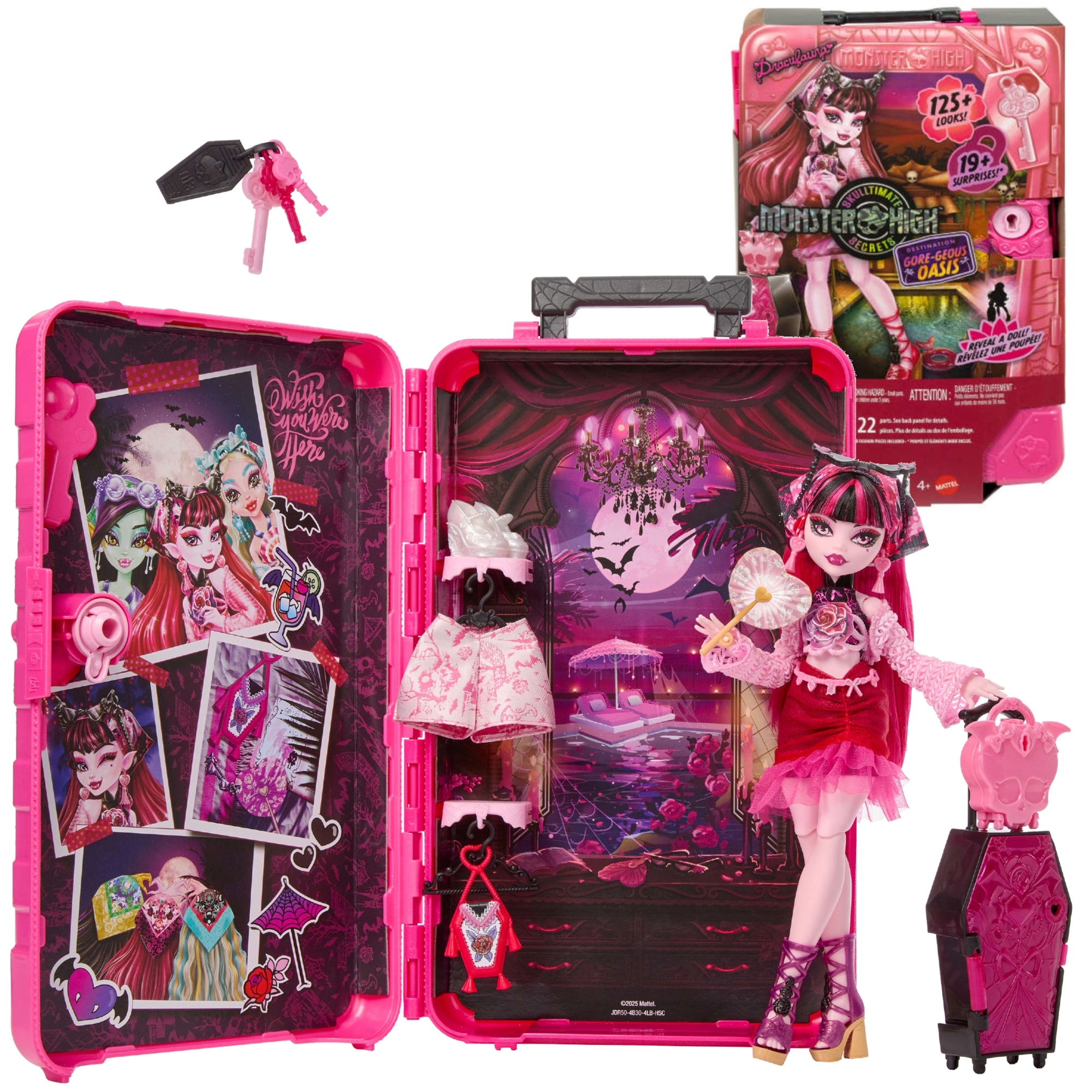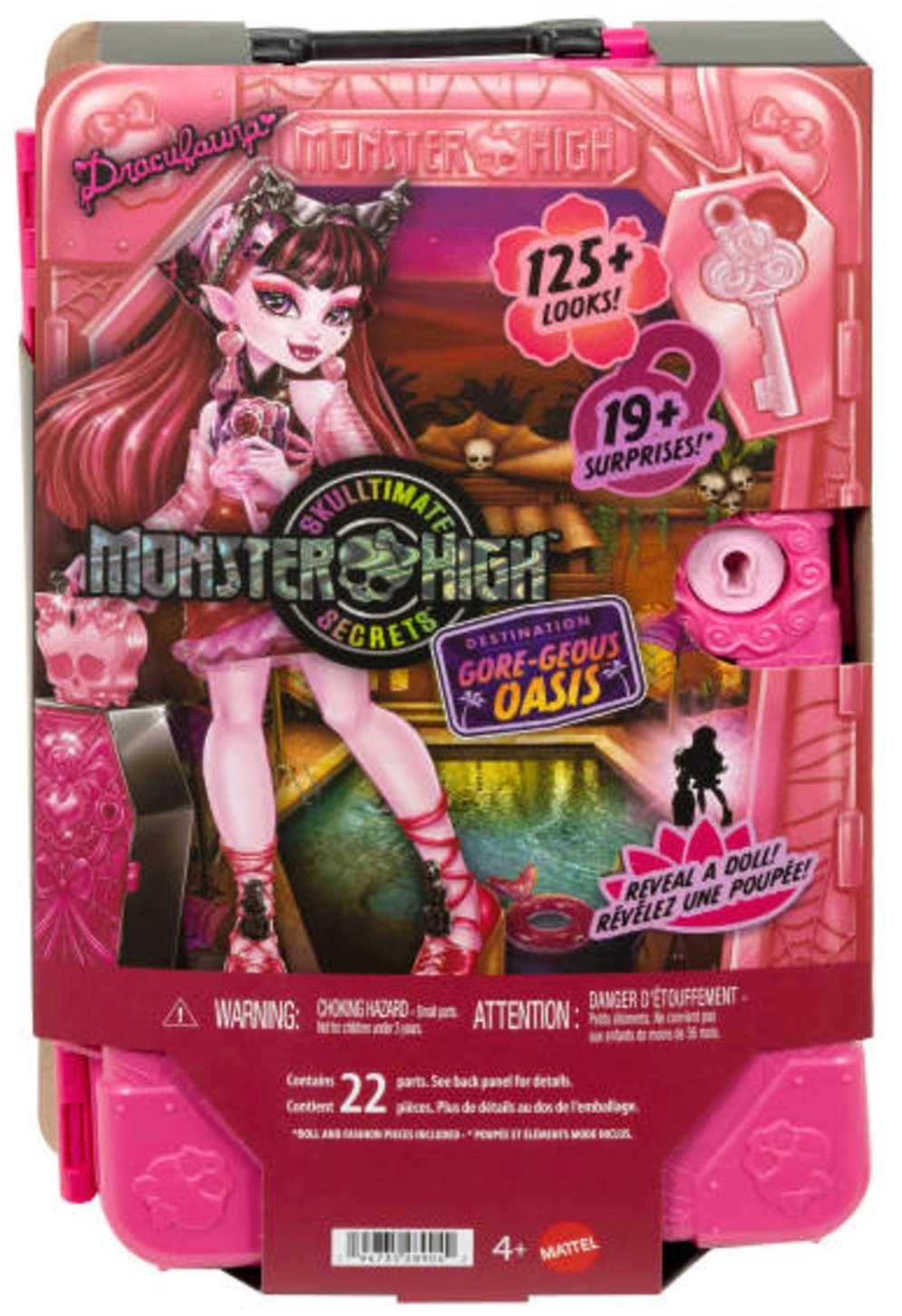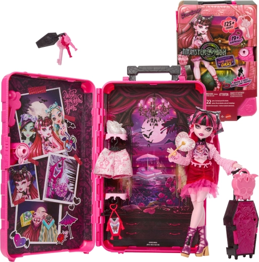 Lutka Draculaura iz serije Monster High Strahotajne poziva djecu u svijet vampirske mode i putovanja. Veliki ružičasto-crni kovčeg na kotačićima može se otvoriti, a unutra se skrivaju vješalice, police i mjesto za pohranu odjeće i dodataka. Potražite tri ključa, otključavajte pretince i otkrivajte nove komade – od naočala i bandane do lepeze i cipela.