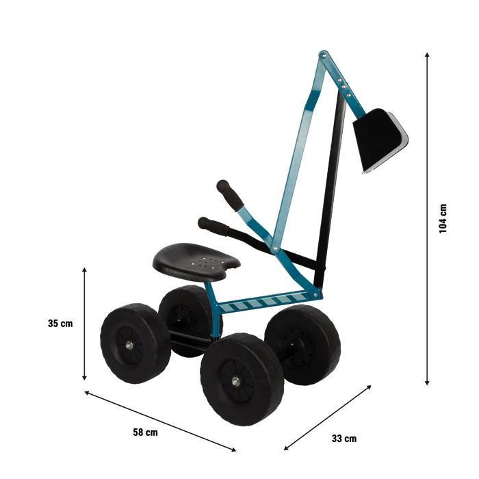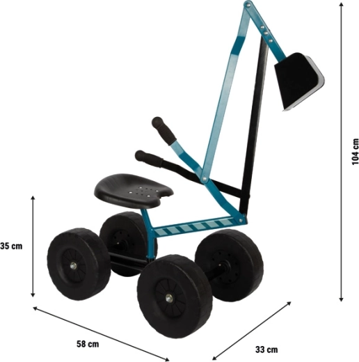 Sjedalo visine 35 cm i ergonomski oblikovane ručke prilagođene su dječjim rukama kako bi vožnja i kopanje bili udobni i intuitivni. Idealno za vrt i pješčanik, potiče aktivno kretanje na otvorenom te razvija prostornu percepciju i timski rad.