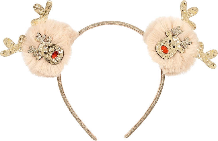Unesite čarobnu atmosferu u blagdanske dane s elegantnim obručem SOUZA. Zahvaljujući tankoj metalnoj bazi širine 0,8 cm presvučenoj sjajnom vrpcom, ugodno se nosi i zadržava oblik cijeli dan. Dvije mekane bež pompone s aplikacijom preslatkih sobića i rogovima posutim zlatnim šljokicama svakome će frizuri dati razigran, ali i dalje profinjen izgled.