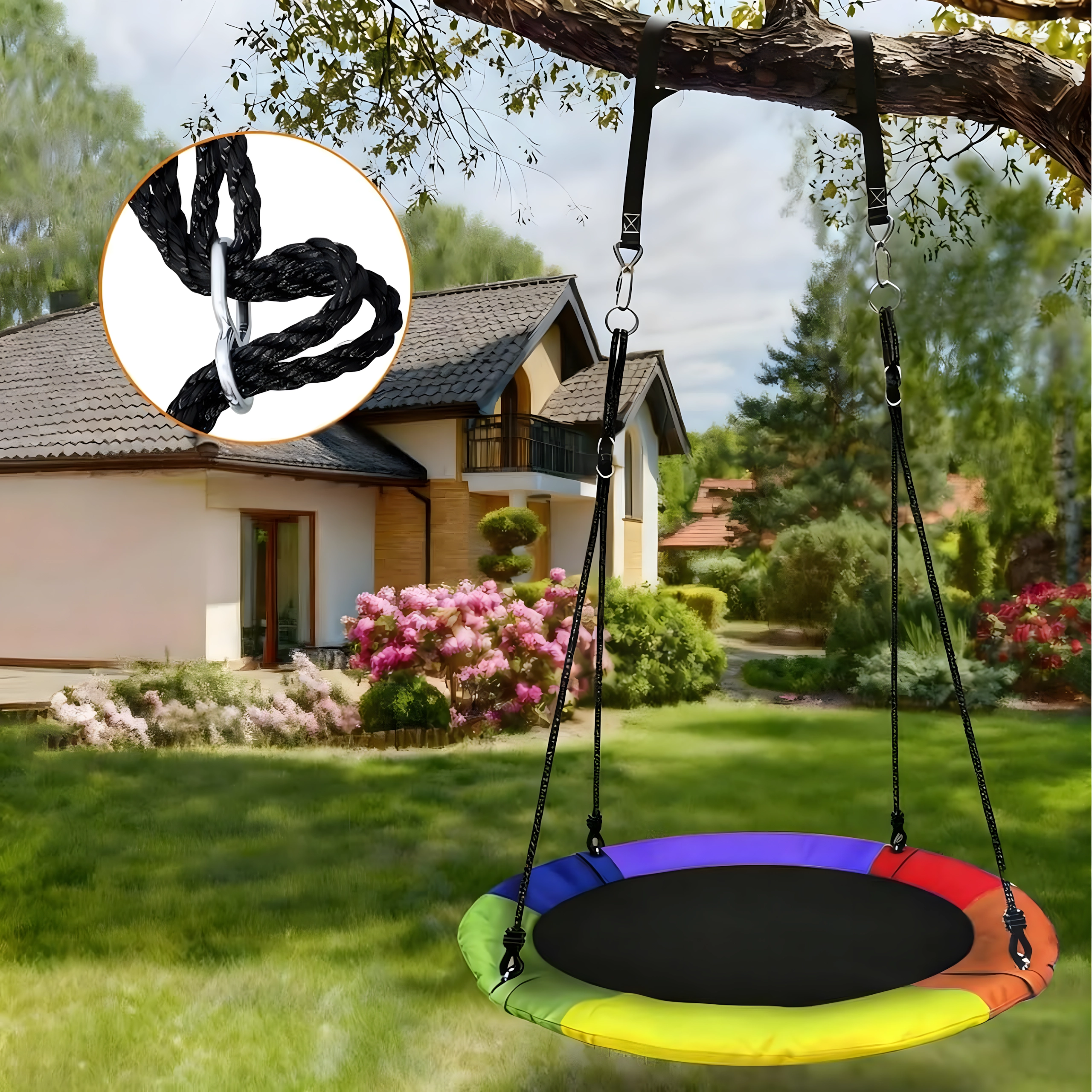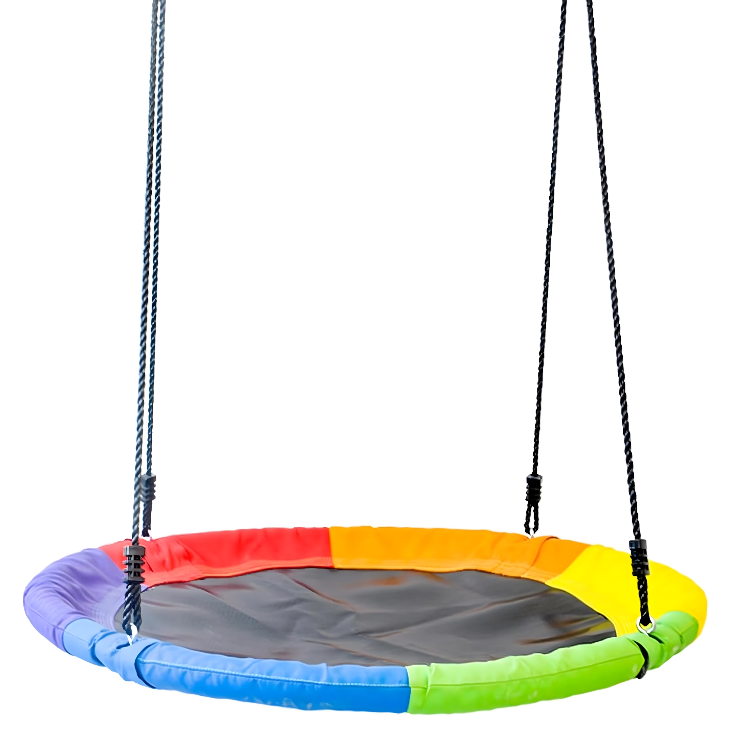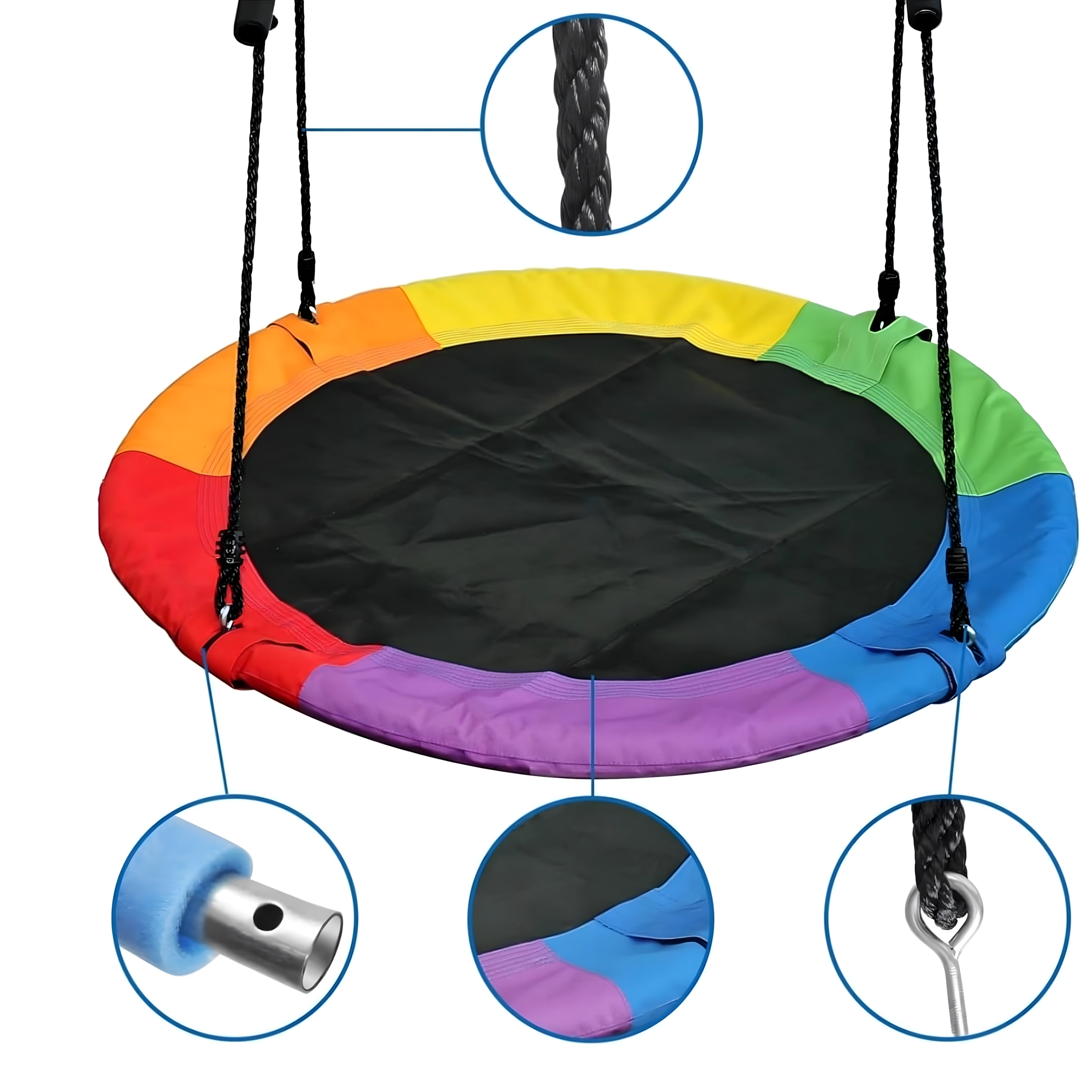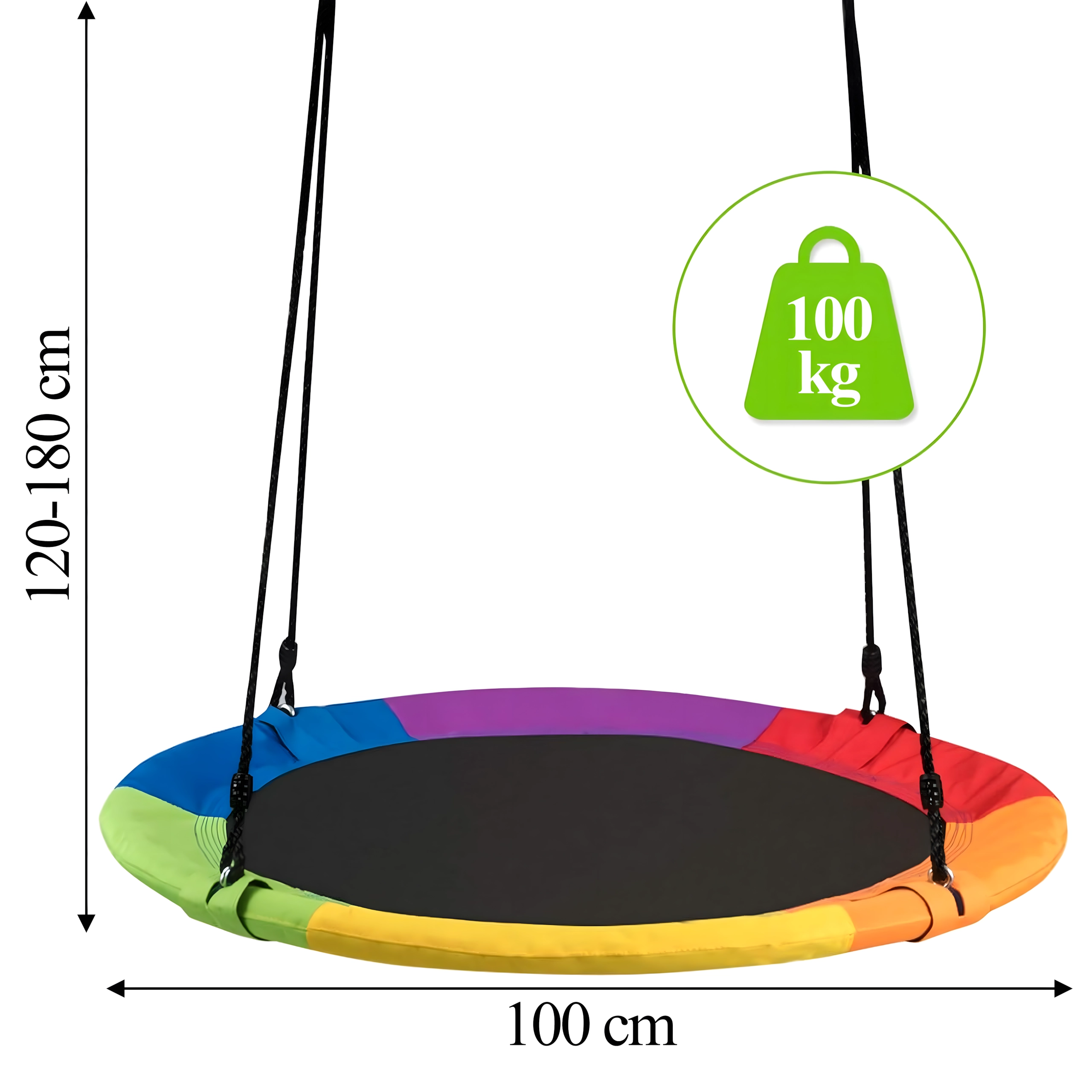 Otkrijte stabilno i udobno roda gnijezdo promjera 100 cm koje će vašu okućnicu pretvoriti u omiljeno mjesto za igru. Mekani podstavljeni rub, izdržljiva sjedeća površina i četverostruko vješanje osiguravaju udobnost i sigurnost. Ljuljačka je pogodna za vanjsku i unutarnju upotrebu, lako se postavlja i odlično izgleda zahvaljujući šarenom rubu.