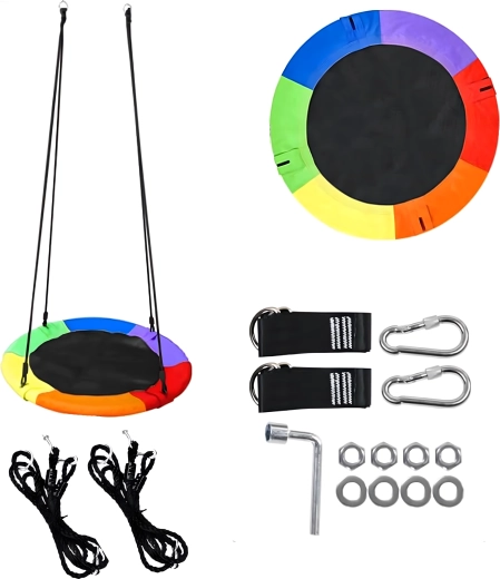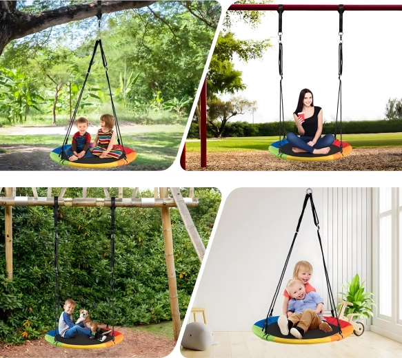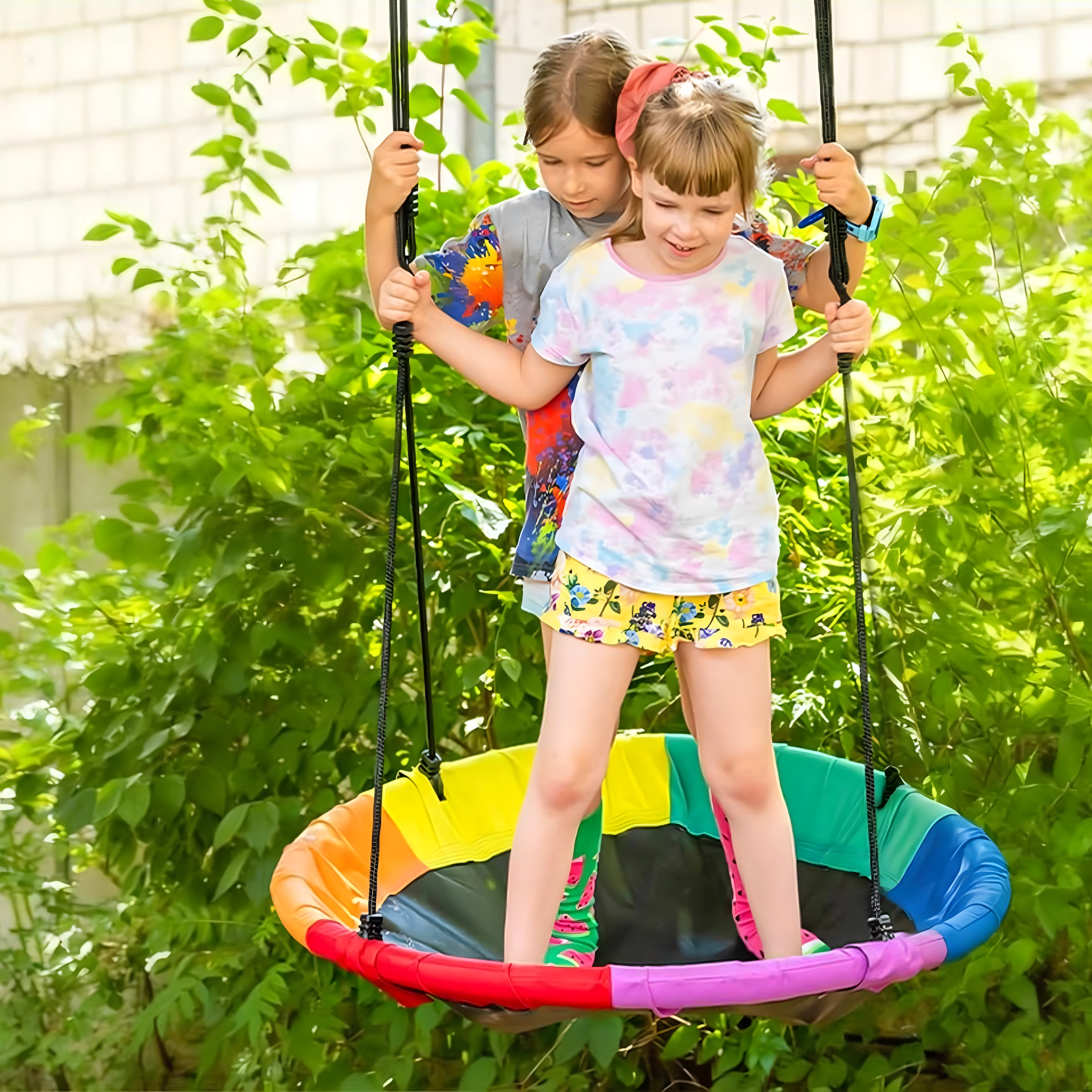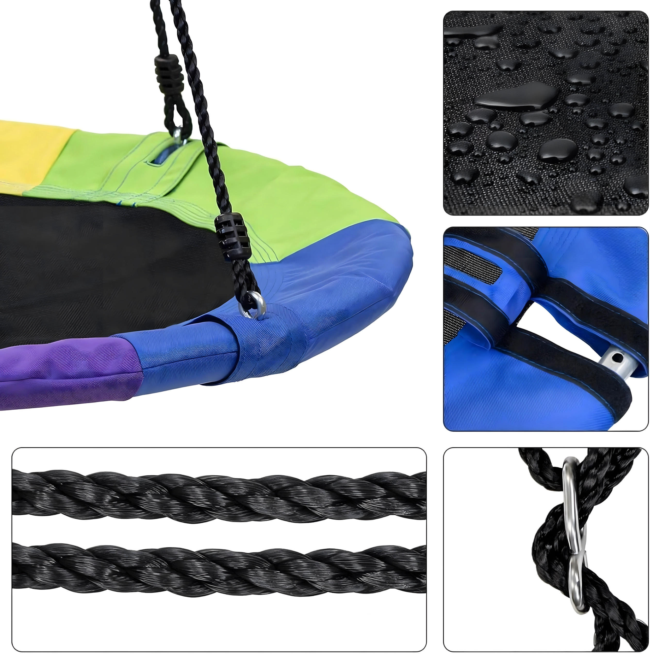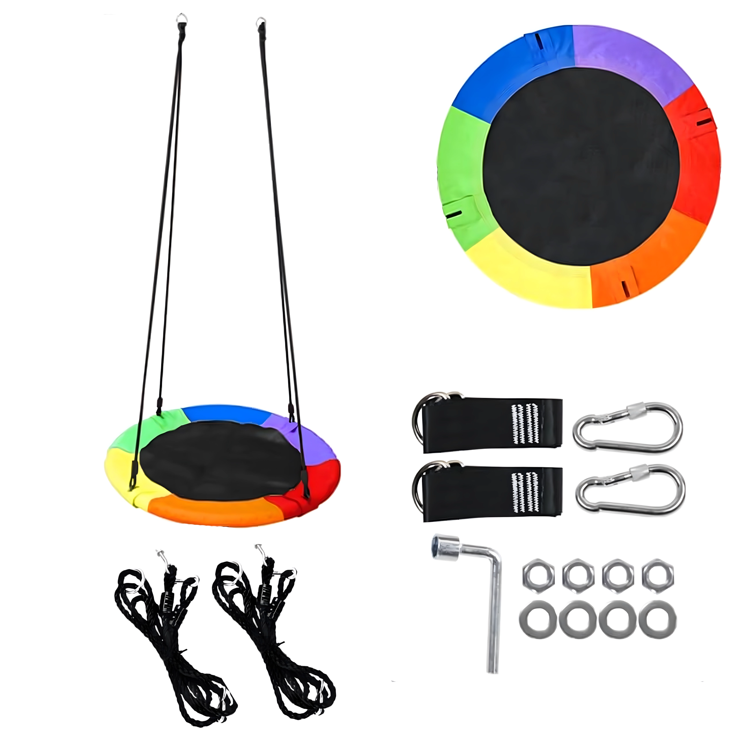 Otkrijte stabilno i udobno roda gnijezdo promjera 100 cm koje će vašu okućnicu pretvoriti u omiljeno mjesto za igru. Mekani podstavljeni rub, izdržljiva sjedeća površina i četverostruko vješanje osiguravaju udobnost i sigurnost. Ljuljačka je pogodna za vanjsku i unutarnju upotrebu, lako se postavlja i odlično izgleda zahvaljujući šarenom rubu.
