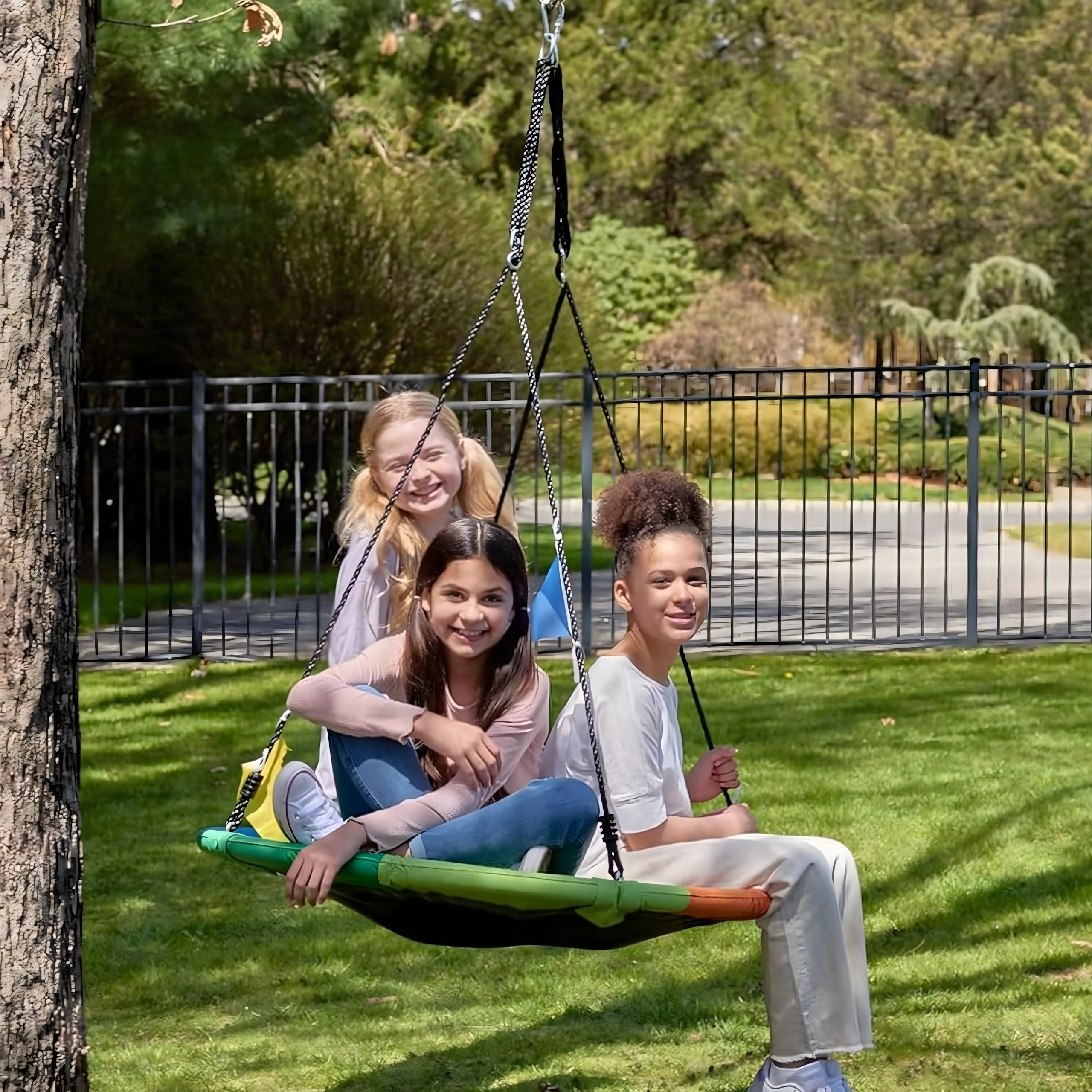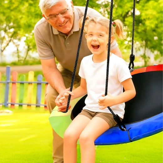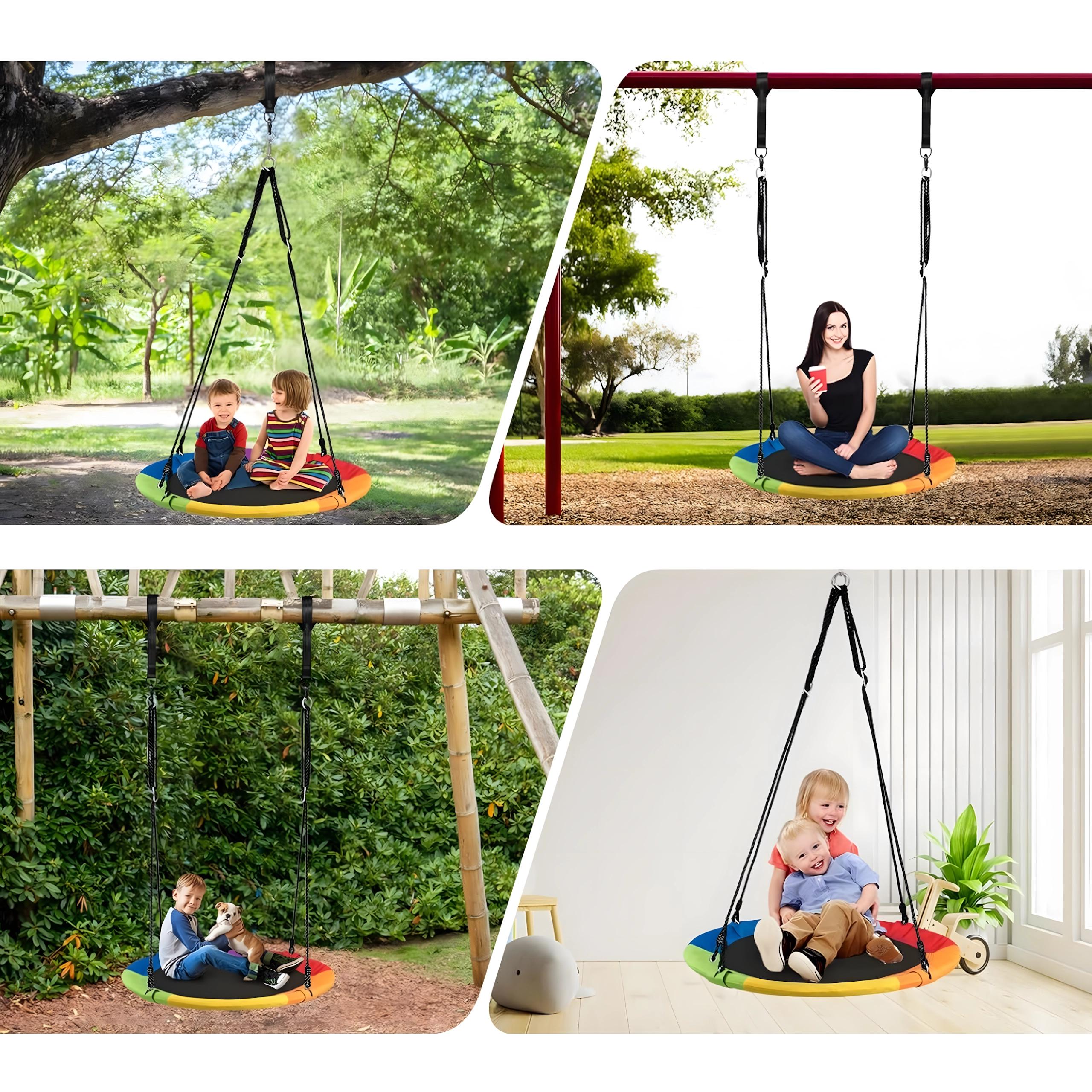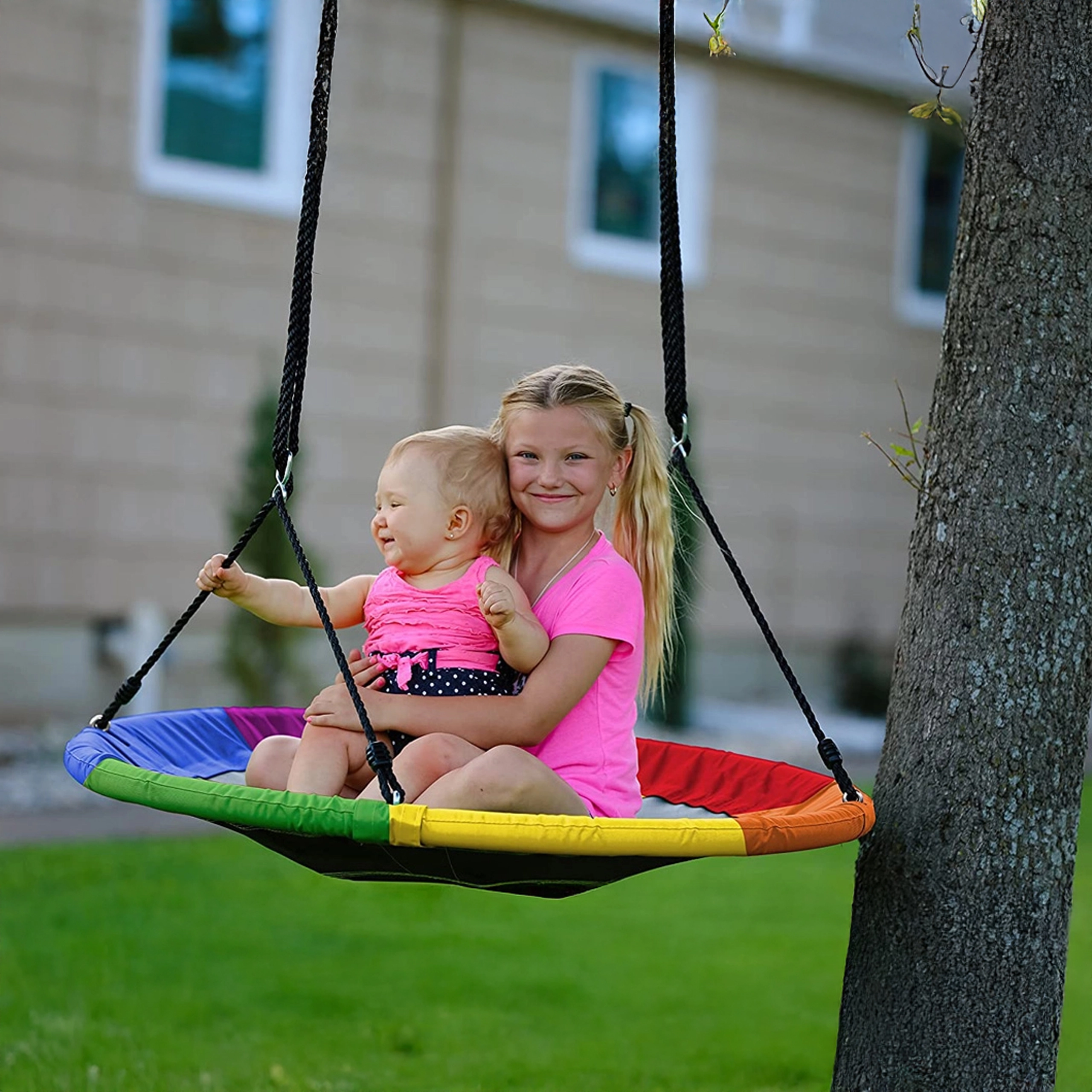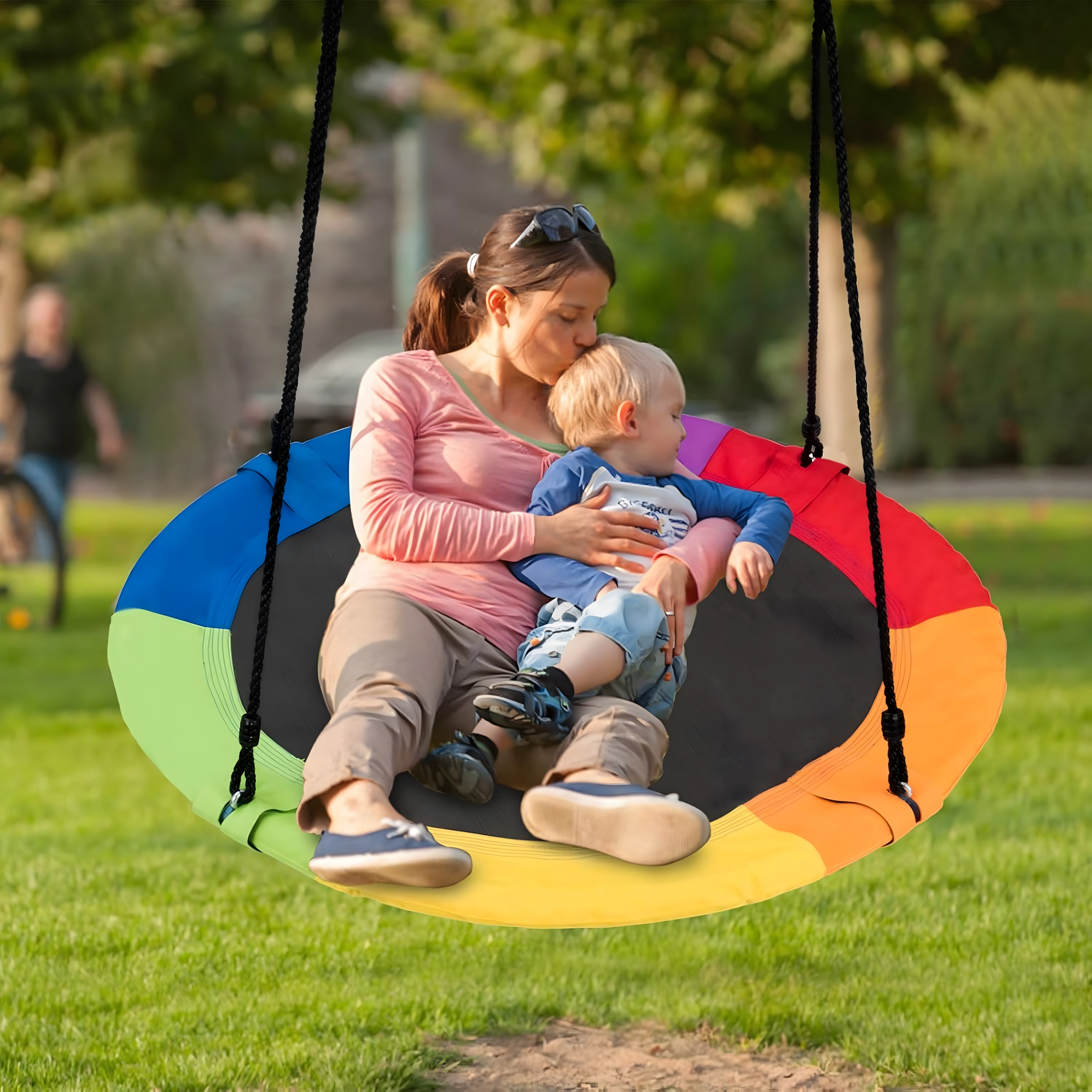 Otkrijte stabilno i udobno roda gnijezdo promjera 100 cm koje će vašu okućnicu pretvoriti u omiljeno mjesto za igru. Mekani podstavljeni rub, izdržljiva sjedeća površina i četverostruko vješanje osiguravaju udobnost i sigurnost. Ljuljačka je pogodna za vanjsku i unutarnju upotrebu, lako se postavlja i odlično izgleda zahvaljujući šarenom rubu.