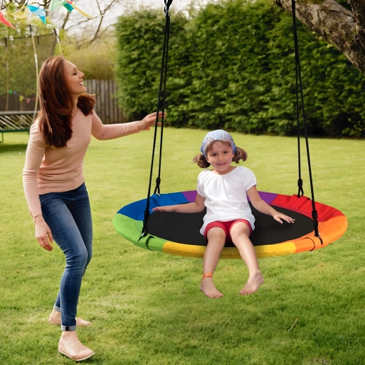 Velika kružna ljuljačka tipa roda gnijezdo promjera 100 cm donosi djeci sate vanjske zabave i odmora. Zahvaljujući širokom sjedalu idealna je za sjedenje i ležanje, nosi više djece odjednom i ima čvrsta pletena užad, izdržljivu tkaninu i metalne karabinere za sigurno vješanje. U pakiranju se nalaze trake za vješanje na stablo i sav potreban pribor.