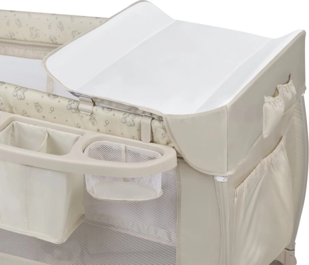 Integrirani pult za presvlačenje i bočna ploča s 3 džepa drže pelene, maramice i sitnice pregledno pri ruci – brzo presvlačenje bilo kada i bilo gdje.