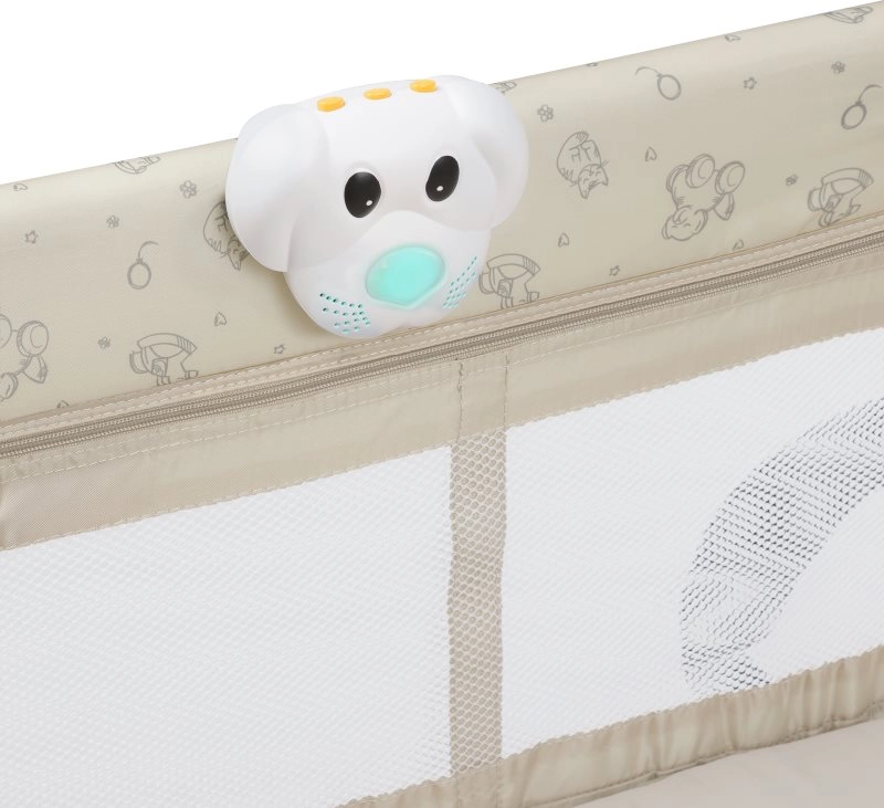 Dio opreme je praktični pult za presvlačenje i bočni organizator s 3 džepa za pelene i sitnice, mreža protiv insekata za miran san na otvorenom i u zatvorenom te zaključavajući kotači za lako premještanje. Bočni ulaz s patentnim zatvaračem potiče samostalnost djeteta i zabavu tijekom dana. Stabilan okvir s zaštitom LockGuard sprječava neželjeno sklapanje, mekana podloga otporna je na habanje, a zaobljeni rubovi povećavaju sigurnost.