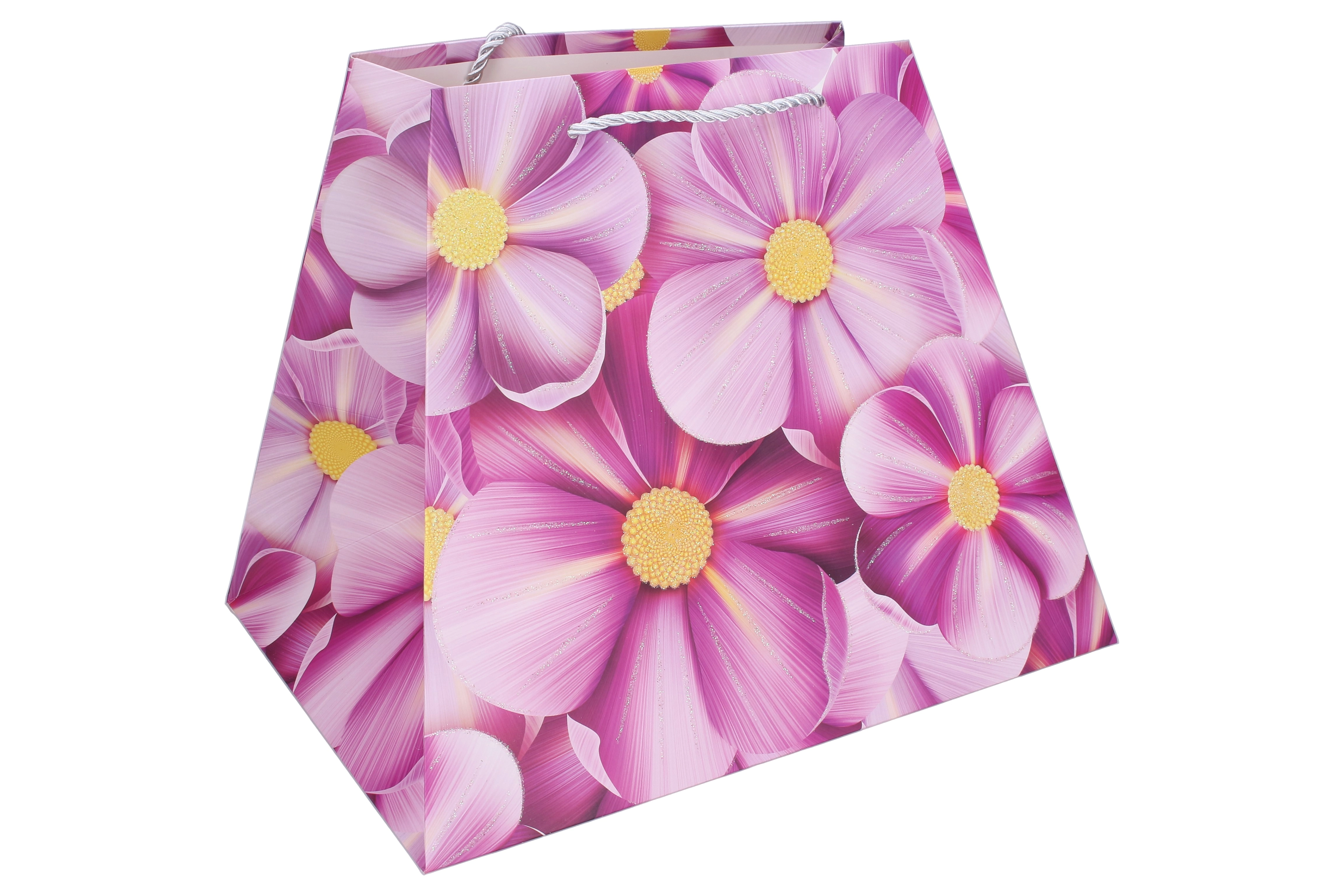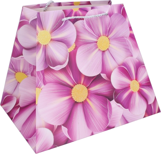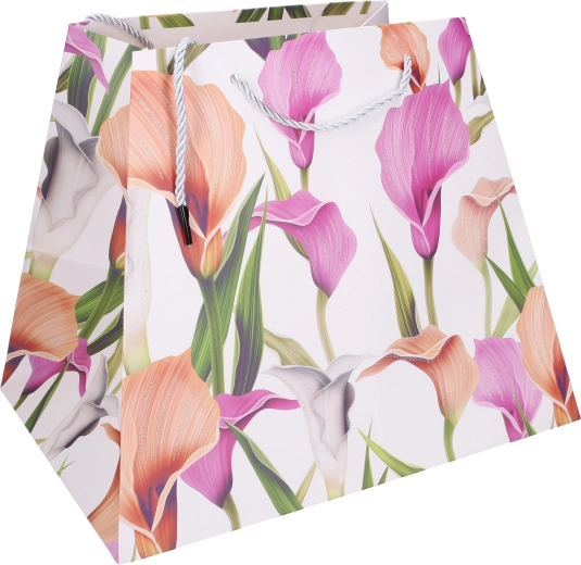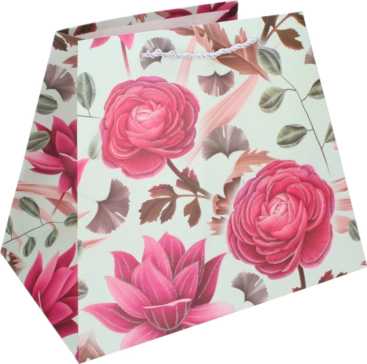 Elegantna poklon-vrećica veličine M, dimenzija 26 × 31,5 × 23 cm, idealna je za stilizirano uručivanje darova tijekom cijele godine. Zahvaljujući čvrstoj papirnatoj konstrukciji, ojačanim užetnim ručkama i proširenom dnu sigurno prenosi lagane do srednje teške poklone. Dostupne su 4 cvjetne varijante za svaku prigodu.