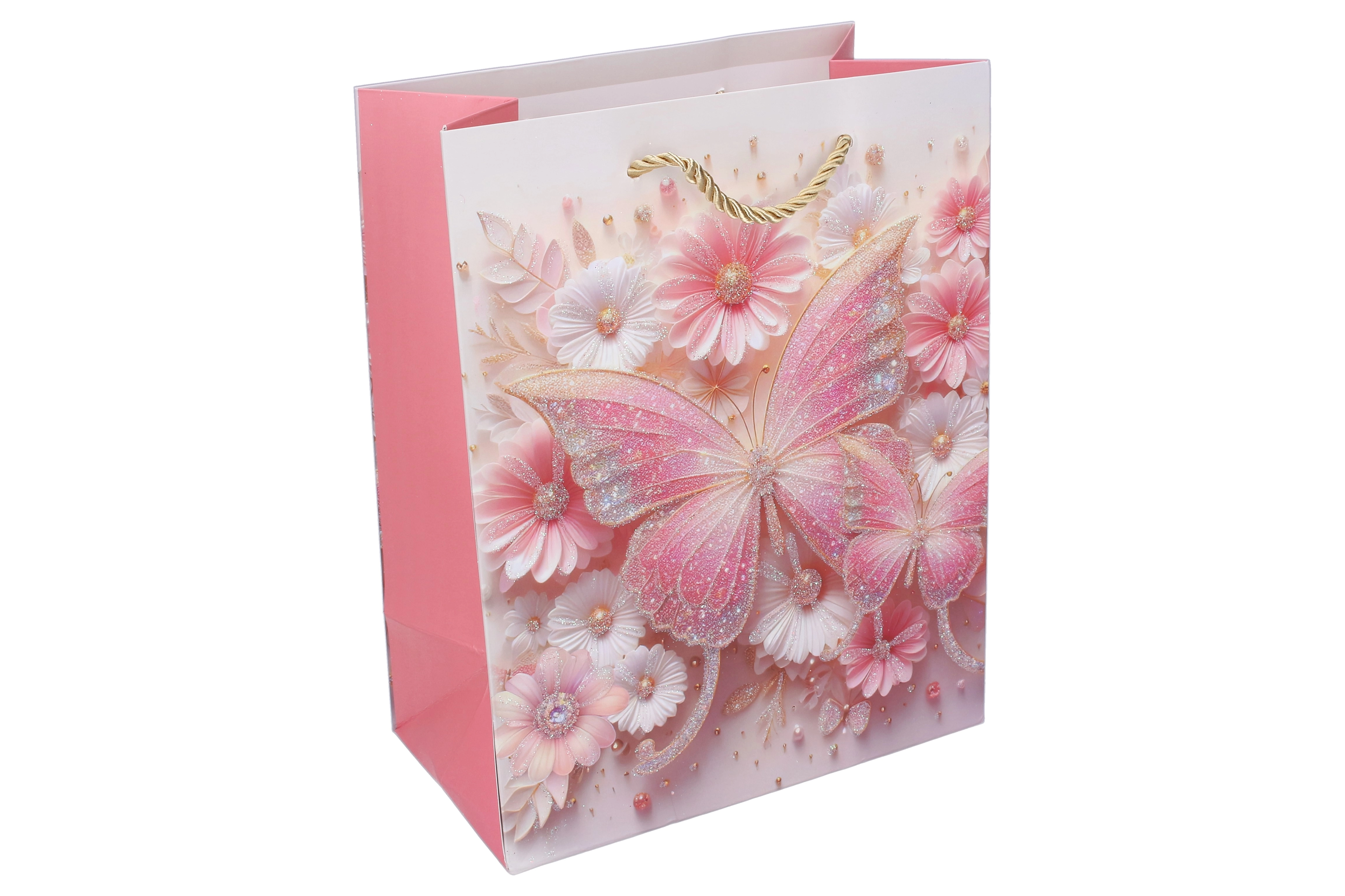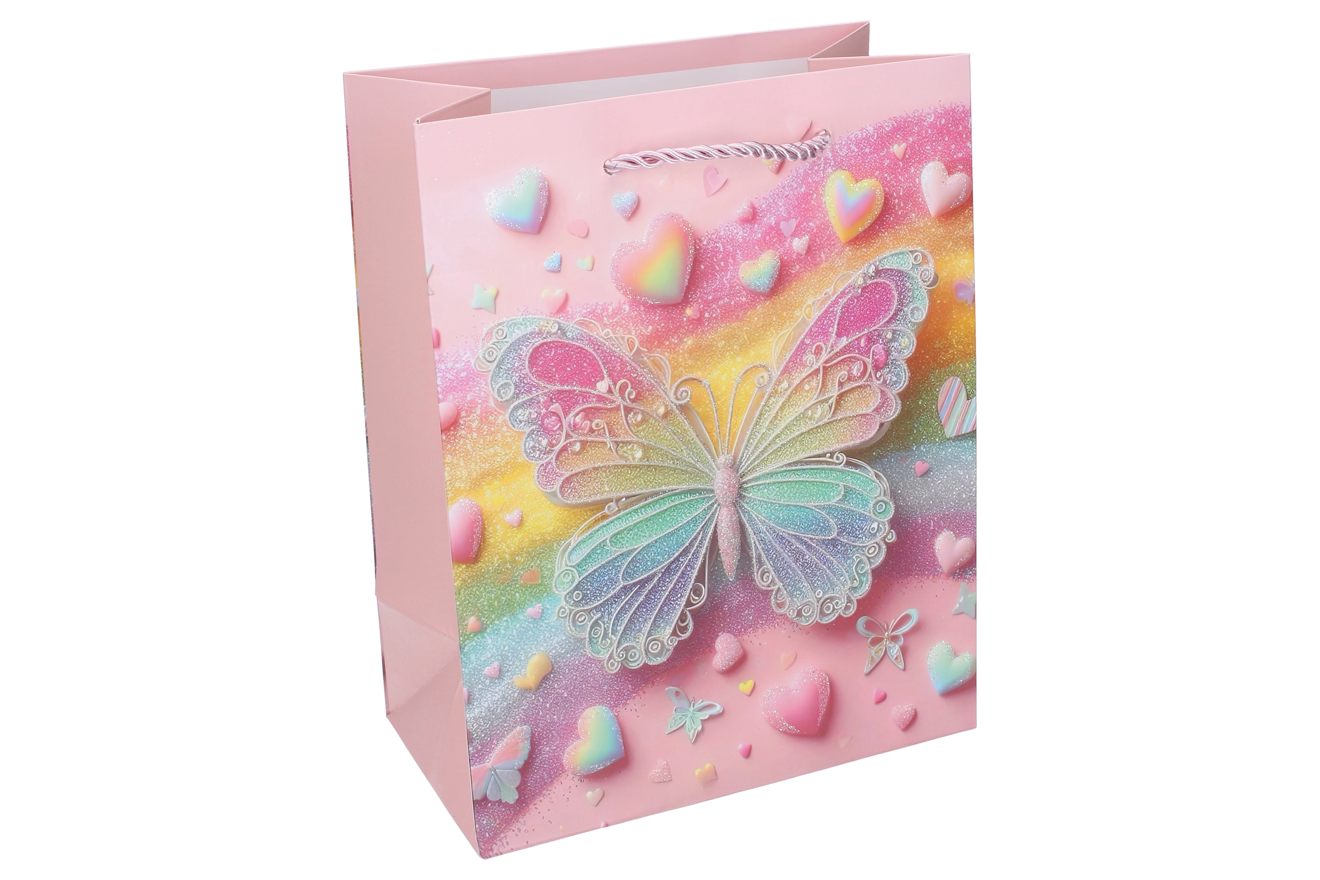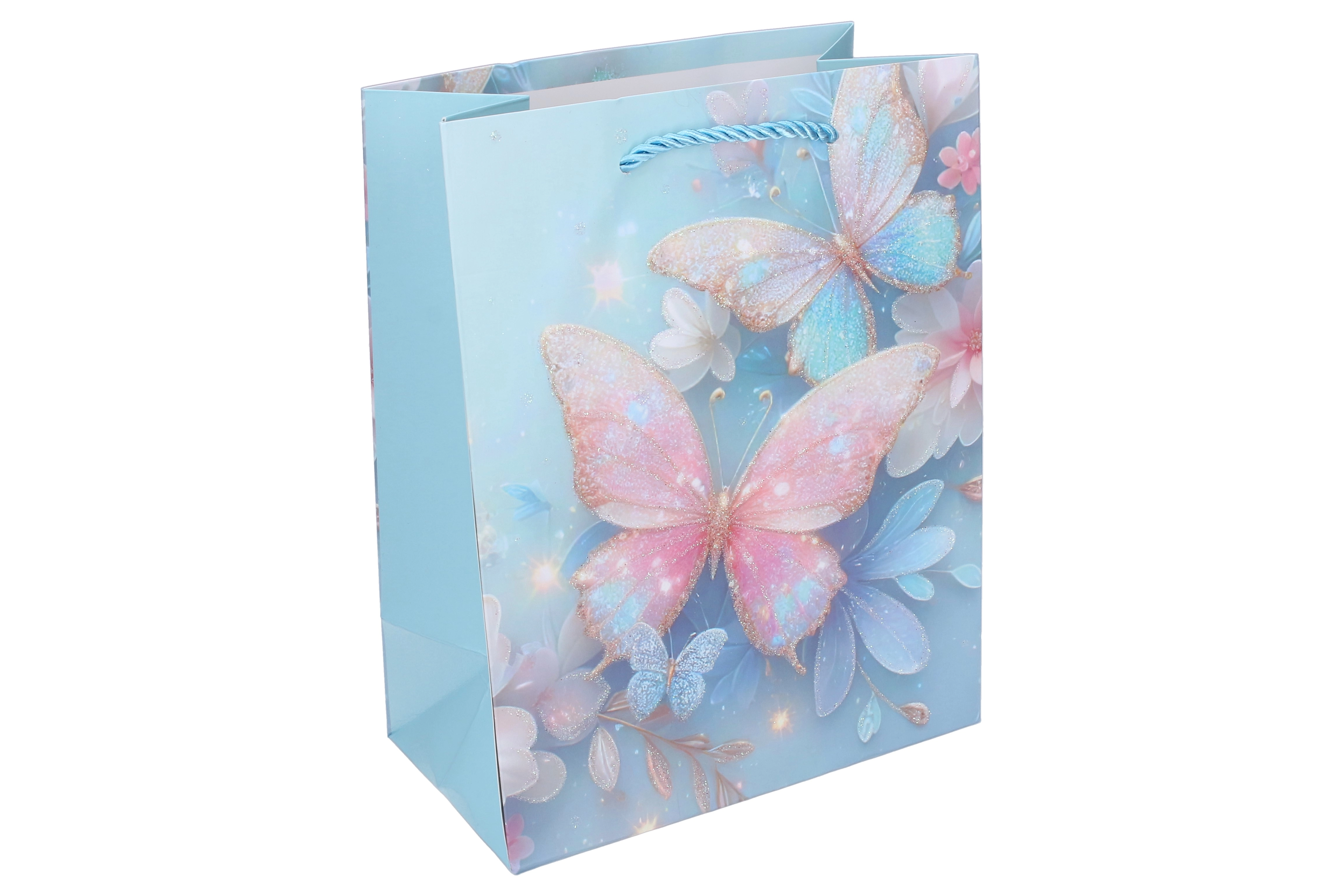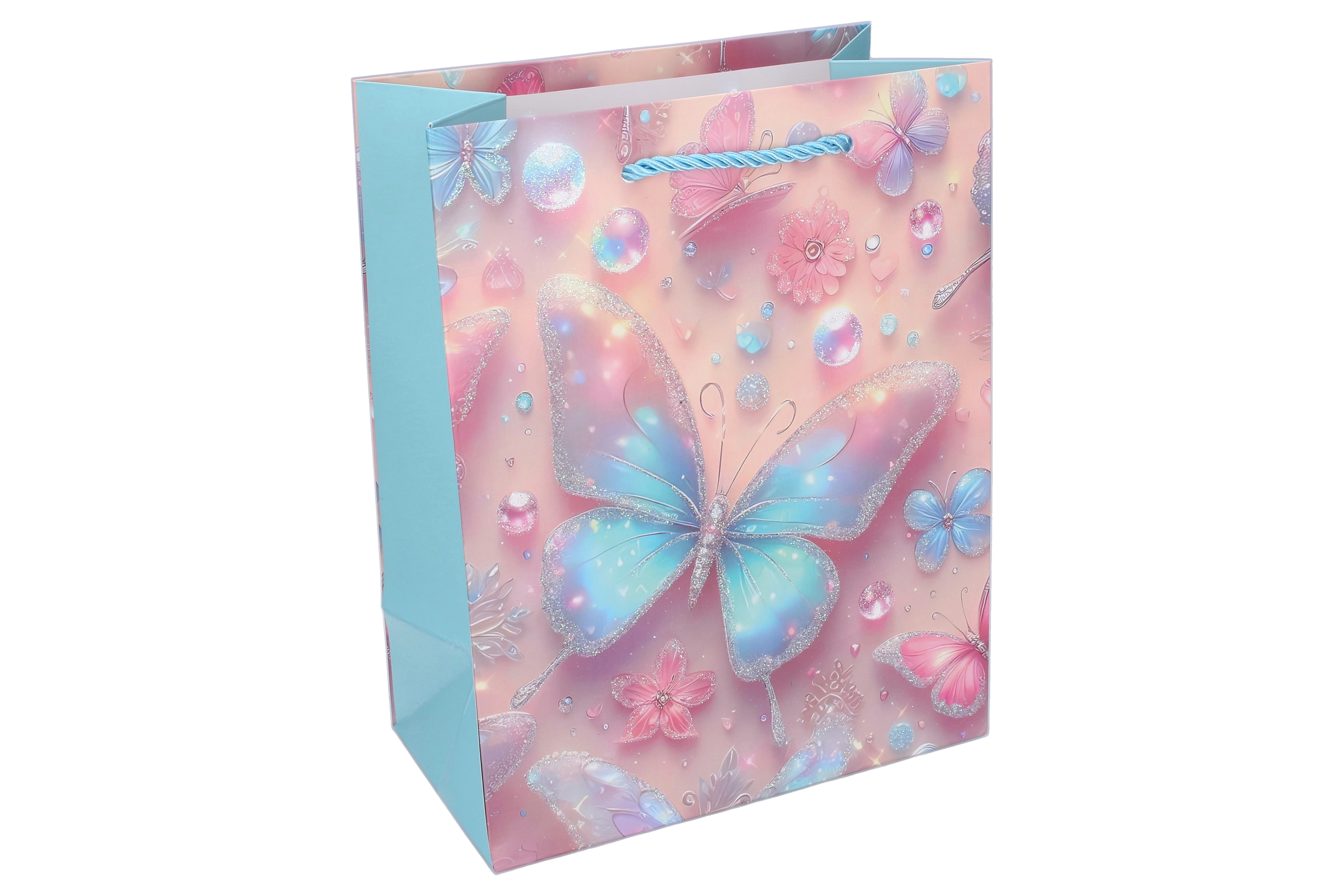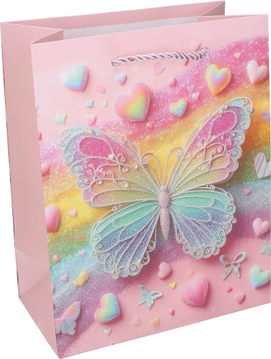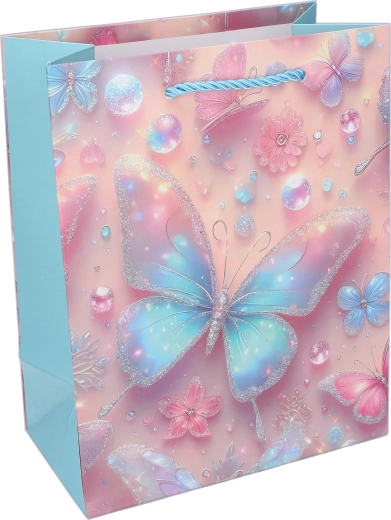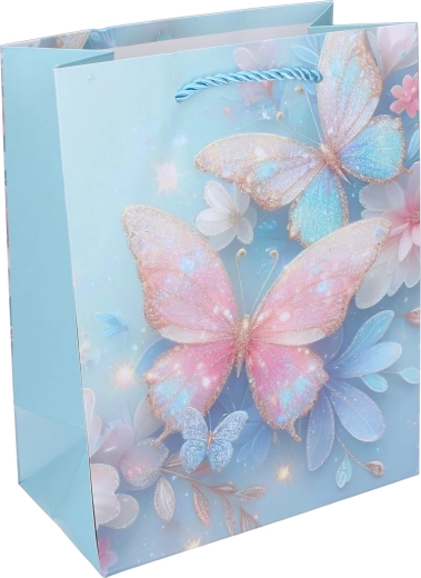 Stilna dječja poklon-vrećica s motivom leptira u veličini L (31 × 40 × 12 cm) za lijepo i sigurno pakiranje darova. Čvrst papir, sjajni detalji i uvijena špaga ručka osiguravaju udobno nošenje. Dostupna u 4 varijante boja s nježnim pastelnim tonovima i cvjetnim elementima.