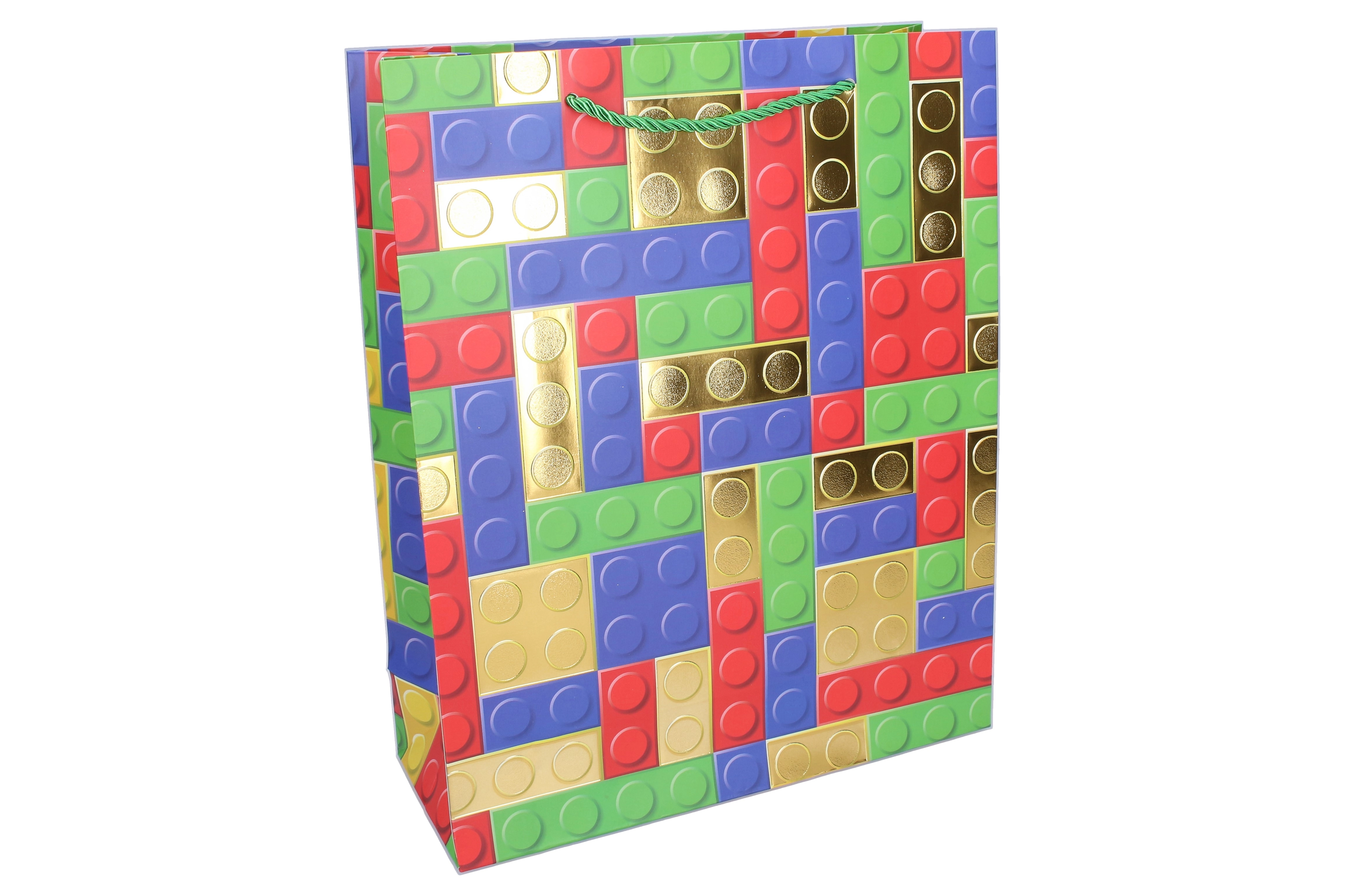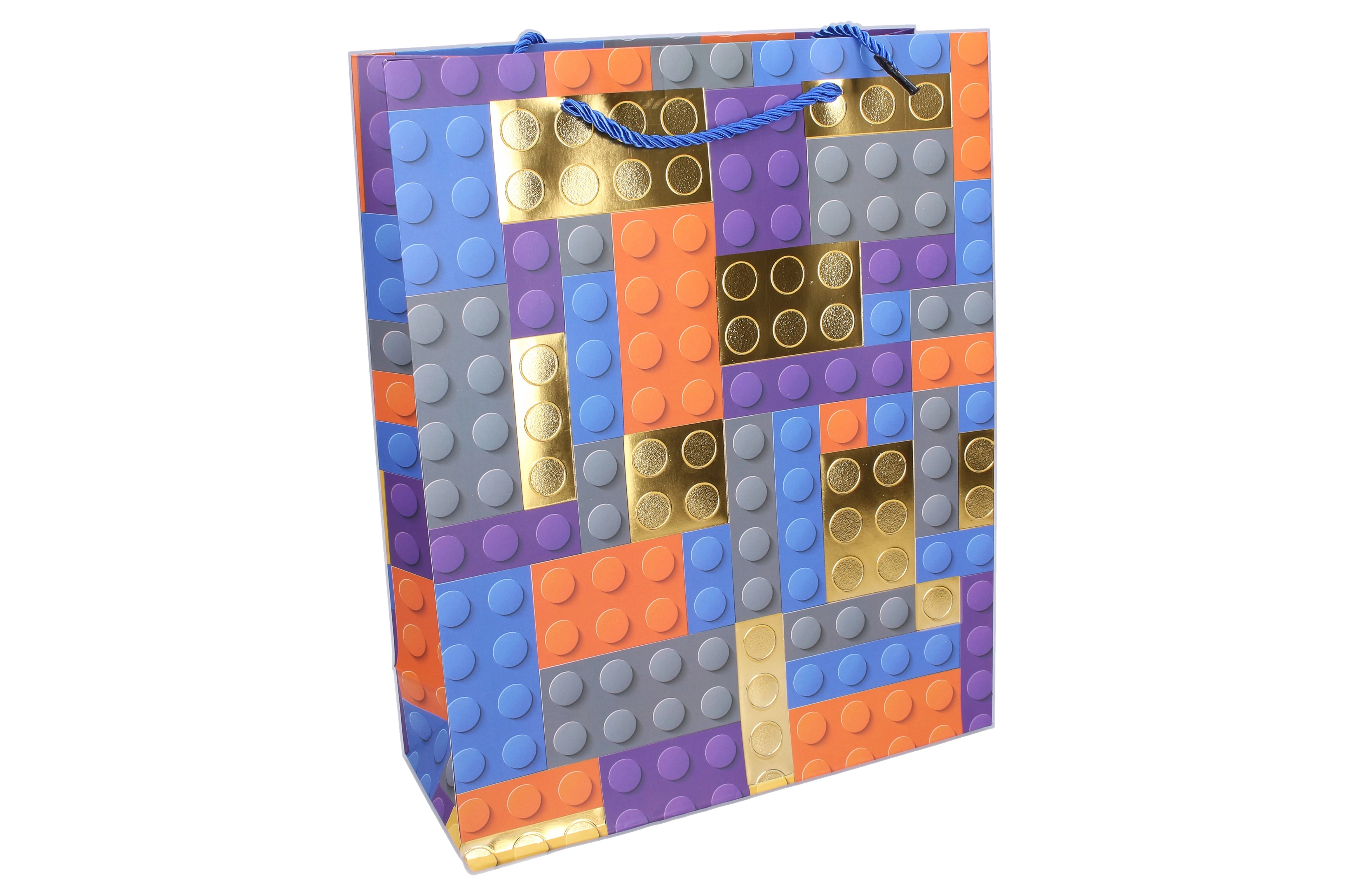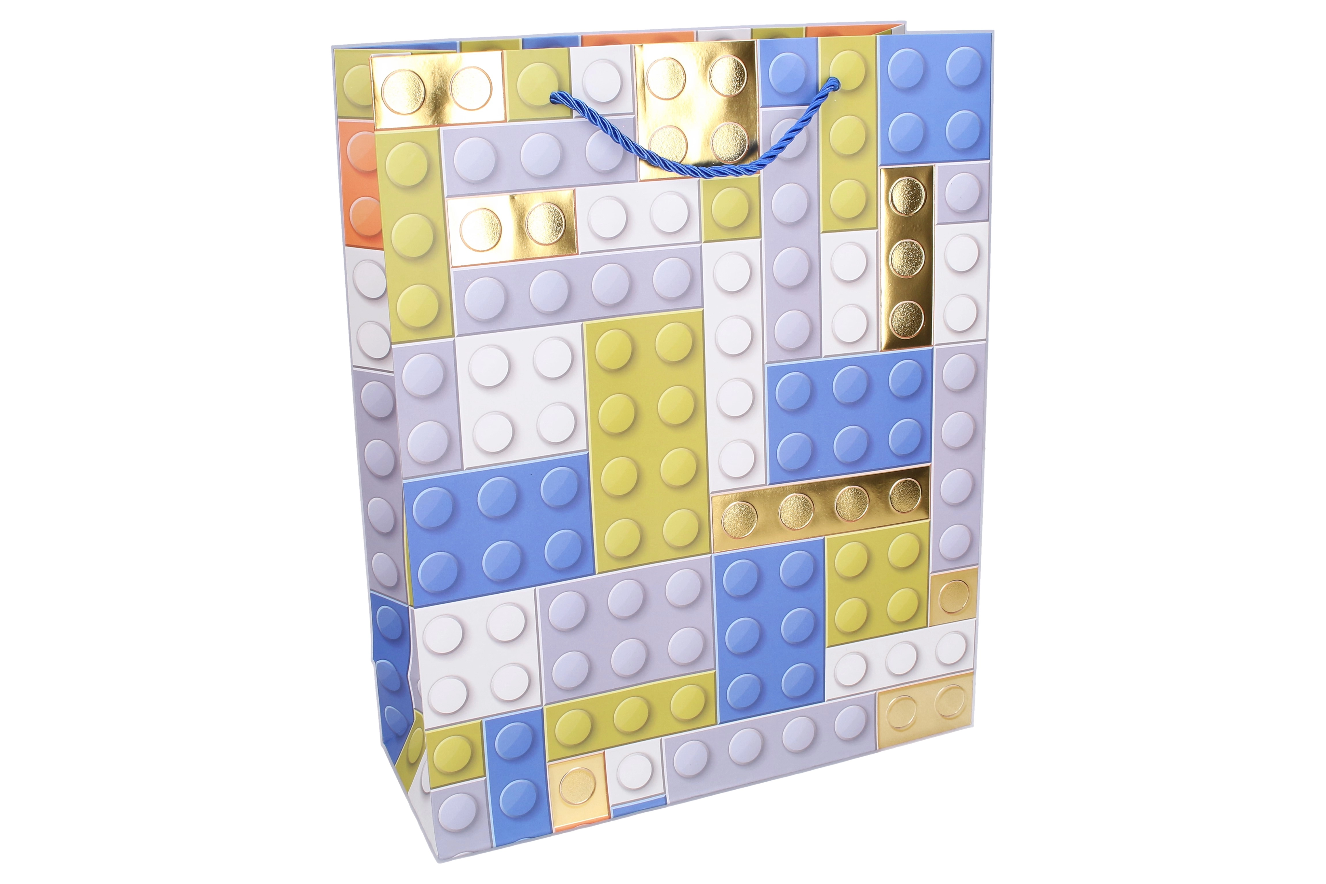 Stilna dječja poklon-vrećica veličine L (31 × 40 × 12 cm) s motivom građevnih kocaka razveselit će male i velike. Nudi čvrstu ručku od uzica, kvalitetnu papirnatu izradu i sjajne zlatne akcente za svečani izgled. Sjajan izbor za rođendane, proslave i blagdane.