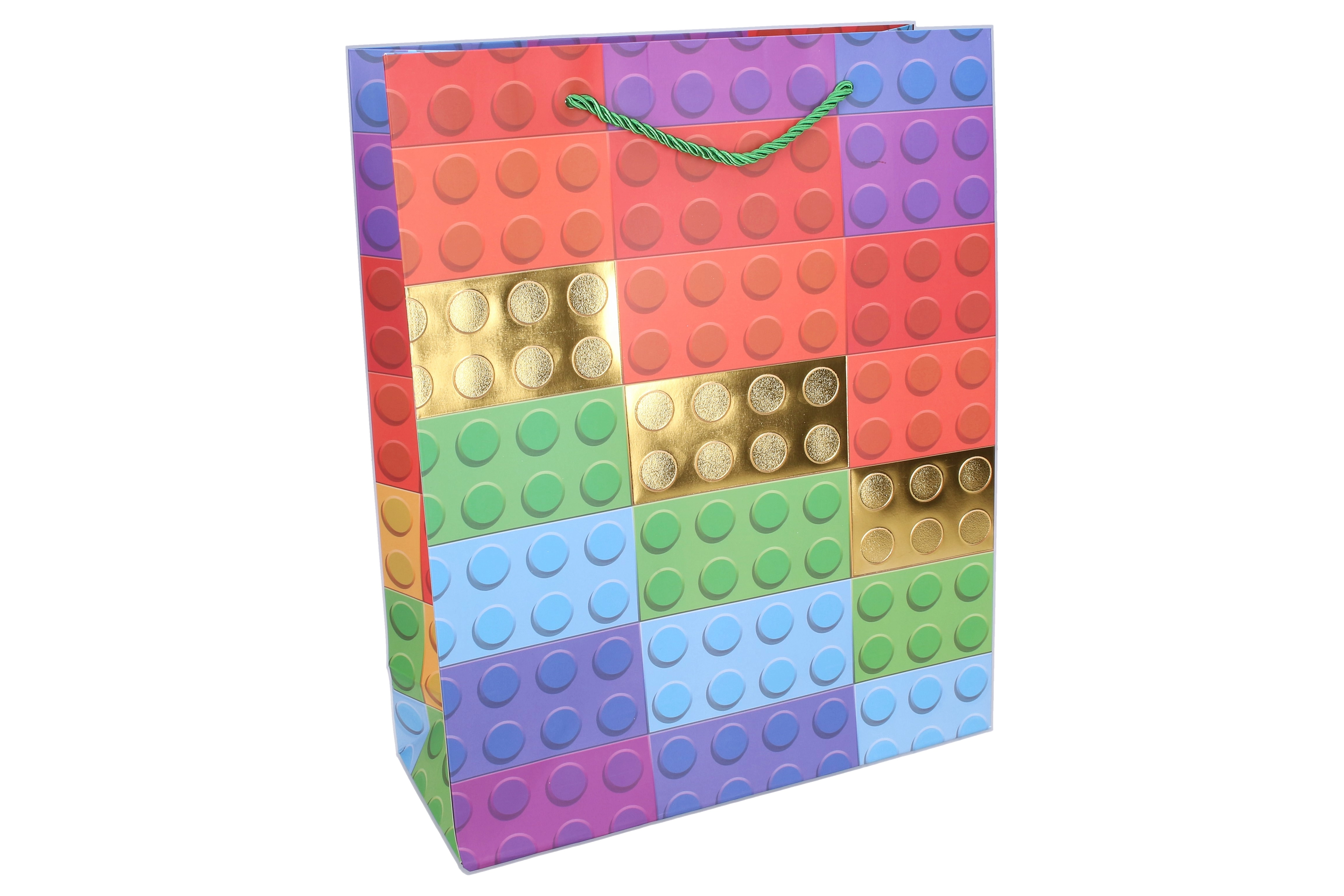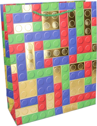 Dodajte poklonu razigran izgled ovom kvalitetnom poklon-vrećicom veličine S (18 × 24 × 8,5 cm). Ističe se modernim tiskom koji podsjeća na građevni set, upotpunjenim metalnim zlatnim elementima koji djeluju svečano i privlačno.