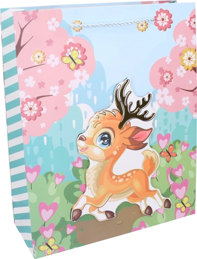 Ova dječja poklon-vrećica veličine M (26 × 32 × 10 cm) odličan je izbor za brzo i efektno pakiranje darova. S motivima omiljenih životinja razveselit će djecu i roditelje, a zahvaljujući čvrstom materijalu sigurno nosi igračke, knjige ili kreativne setove.