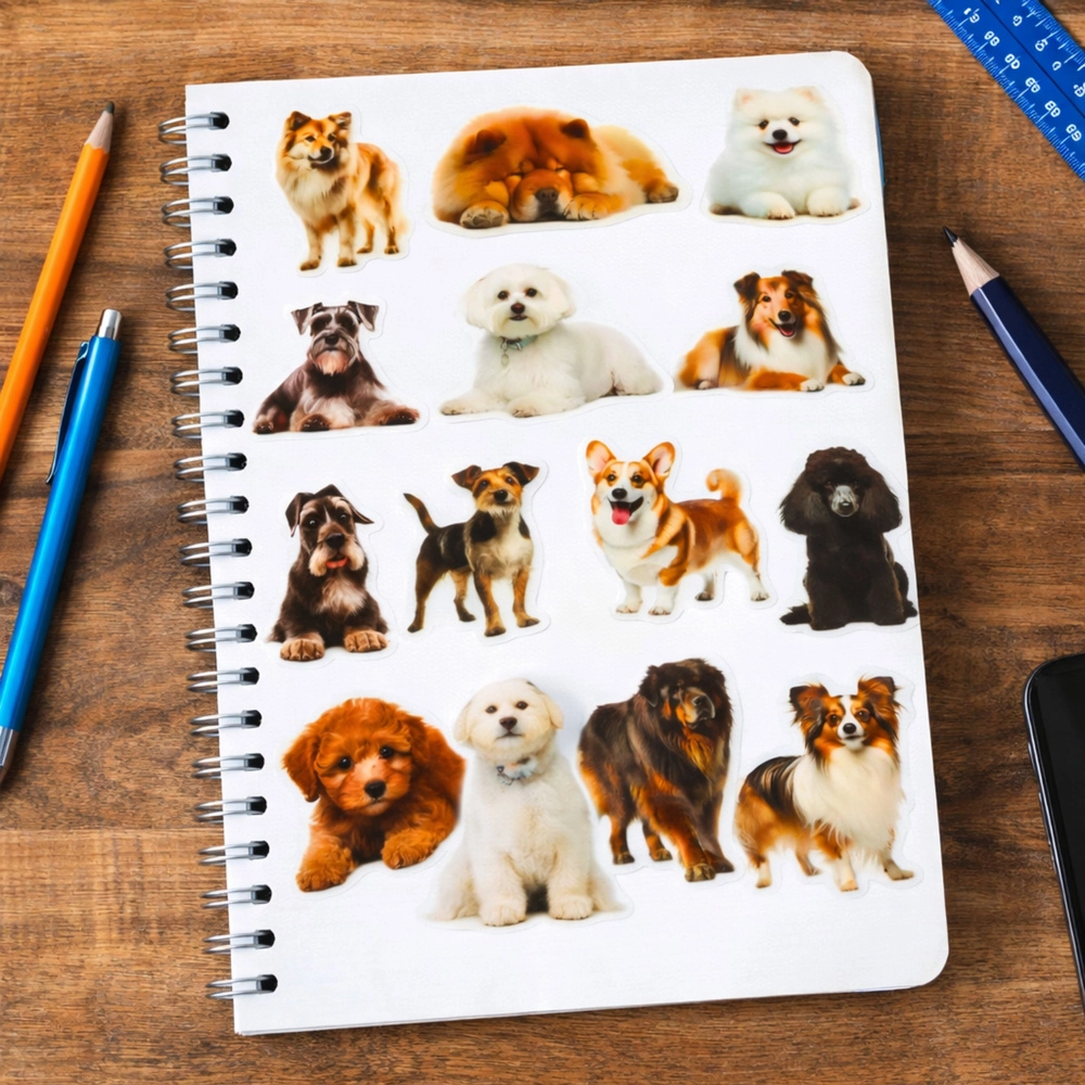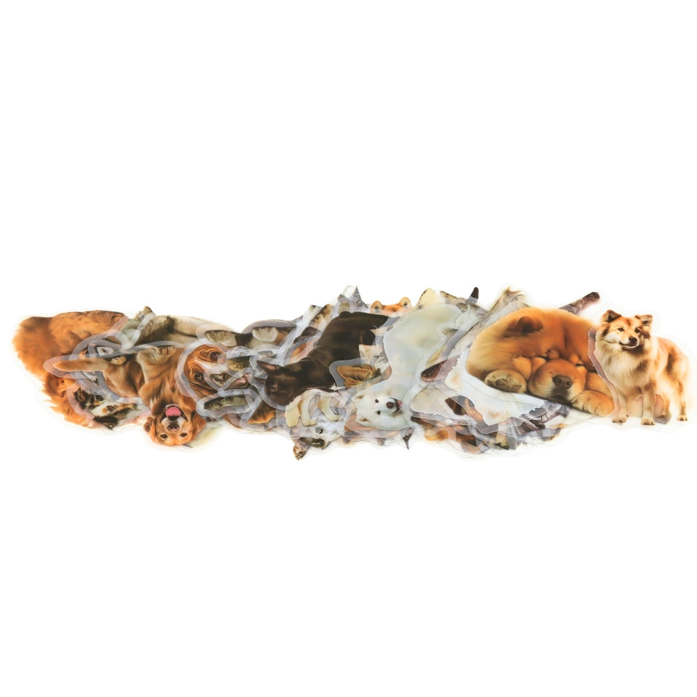 Nakon lijepljenja ističe se samo motiv psa – bez ometajućeg bijelog ruba. Idealno za šarene bilježnice, omote i kreativne projekte.