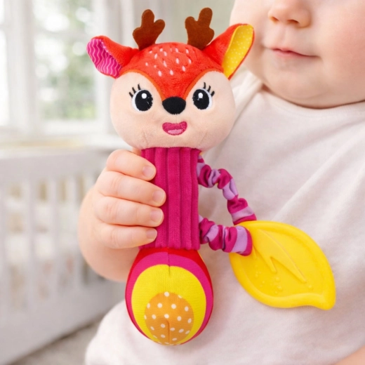 Preslatka plišana zvečka u obliku jelenca spaja zvečku, pištalicu i meku grickalicu za olakšanje tijekom nicanja zubića. Zahvaljujući mekanim materijalima, lakom držanju i različitim teksturama izvrsno potiče djetetova osjetila i podržava koordinaciju već od prvih mjeseci.