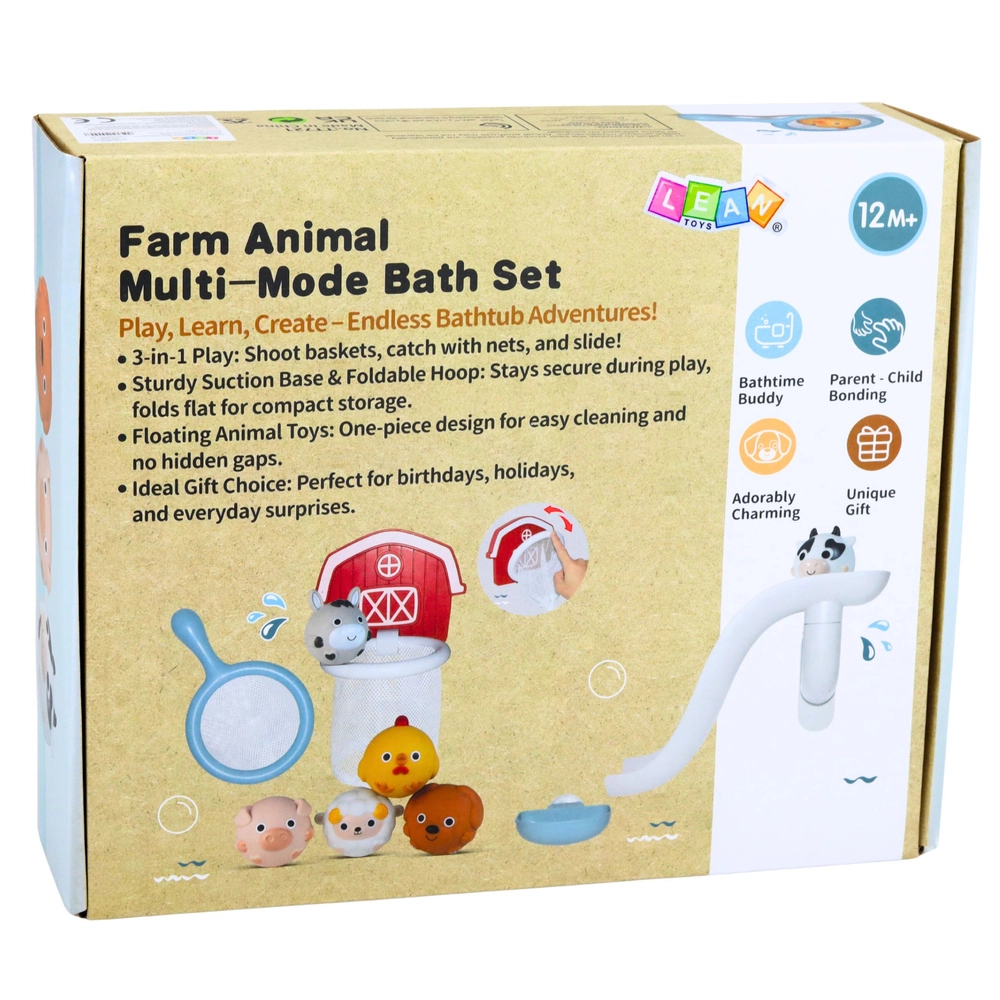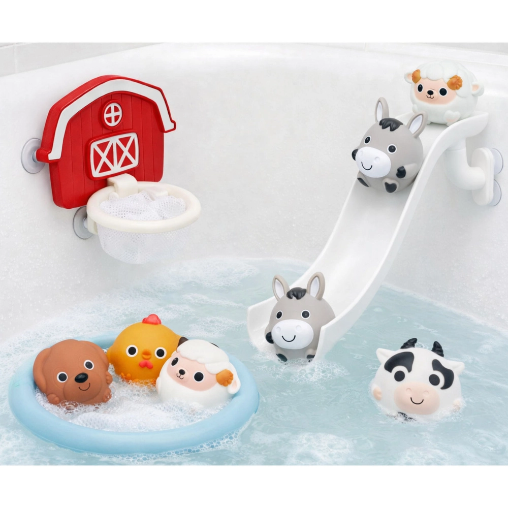 Pretvorite kupanje u zabavu s farm setom! Djeca će uživati u toboganu za životinjice, košarici sa sitom za hvatanje i životinjicama za špricanje i stiskanje koje plutaju na vodi. Dijelovi se zahvaljujući vakuumskim čašicama lako pričvršćuju na glatke površine, a meki, sigurni materijali prikladni su za male dječje ručice.