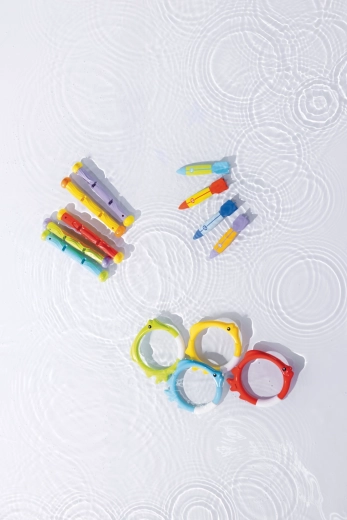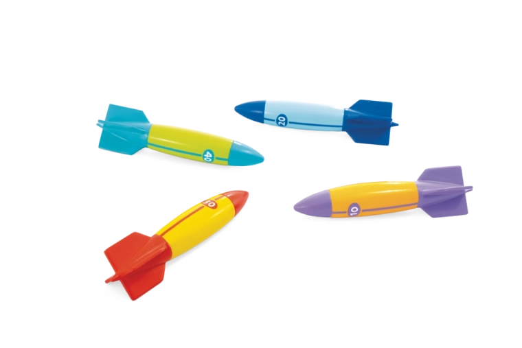 Otkrijte ljetnu zabavu u vodi sa setom potapajućih torpeda koji motivira djecu na kretanje, poboljšava snalaženje pod vodom i potiče trening daha. Zahvaljujući aerodinamičnom obliku torpeda stabilno klize do 6 metara, a njihov mek, ali čvrst materijal osigurava sigurnu igru.