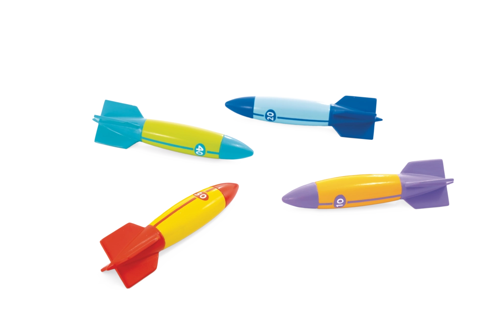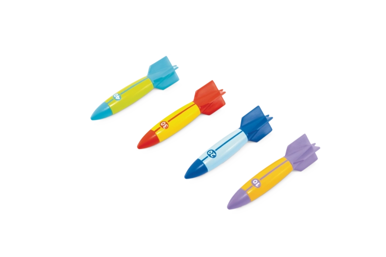 Svako torpedo ima upadljive boje i brojčane oznake (10/20/30/40) za lako razlikovanje i bodovanje. Stabilizacijska krilca olakšavaju hvat i kontrolu smjera, pa djeca postižu duža i preciznija bacanja pod vodom – odlično za natjecanja s prijateljima u bazenu ili na kupalištu.