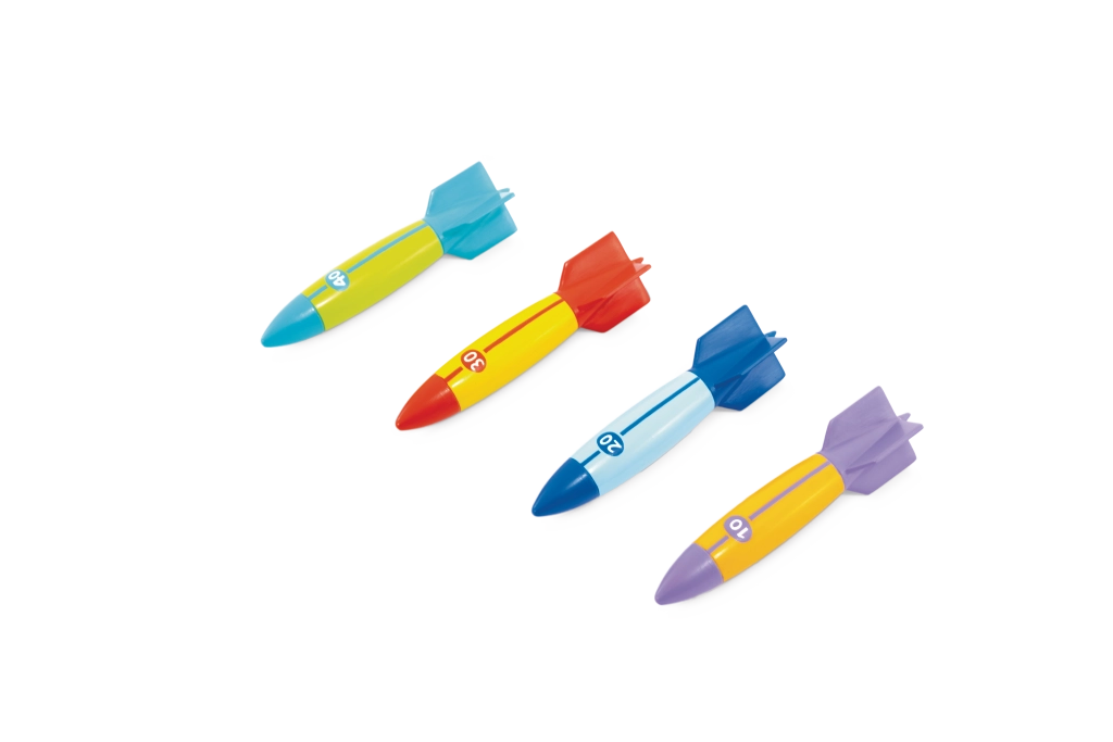 Zabavni set od četiri potapajuća torpeda za djecu od 6 godina donosi akcijske igre u bazenu. Torpeda s aerodinamičnim oblikom glatko klize ispod površine do 6 m i imaju šarena oznake s bodovnim vrijednostima za natjecateljsku igru. Izrađena od mekog, ali izdržljivog materijala za sigurnu uporabu, s krilcima za siguran hvat i precizno bacanje. Idealna za trening disanja, ronjenja i koordinacije. Sigurna mekana konstrukcija, glatko klizenje do 6 m, jarke boje i bodovno označavanje.