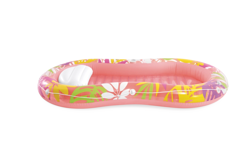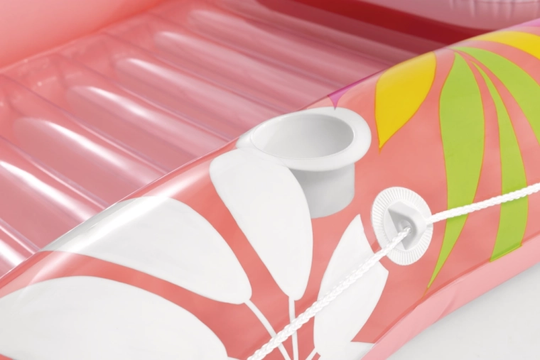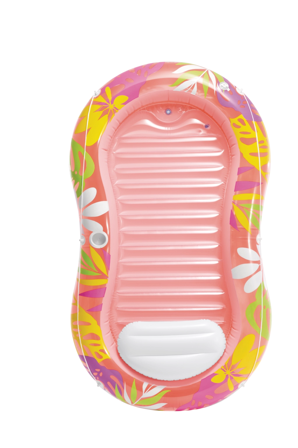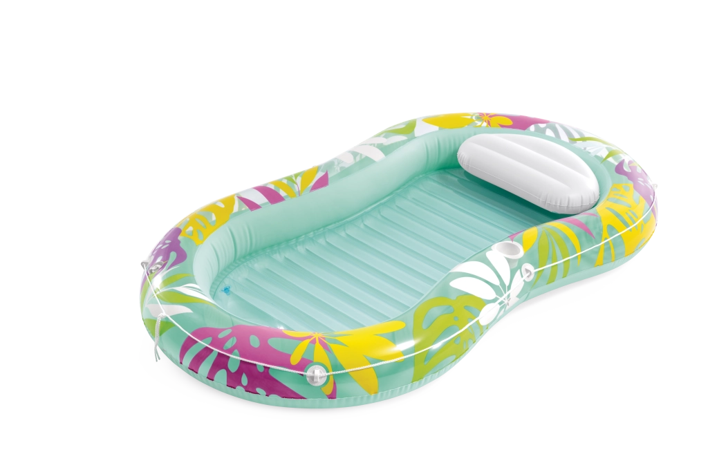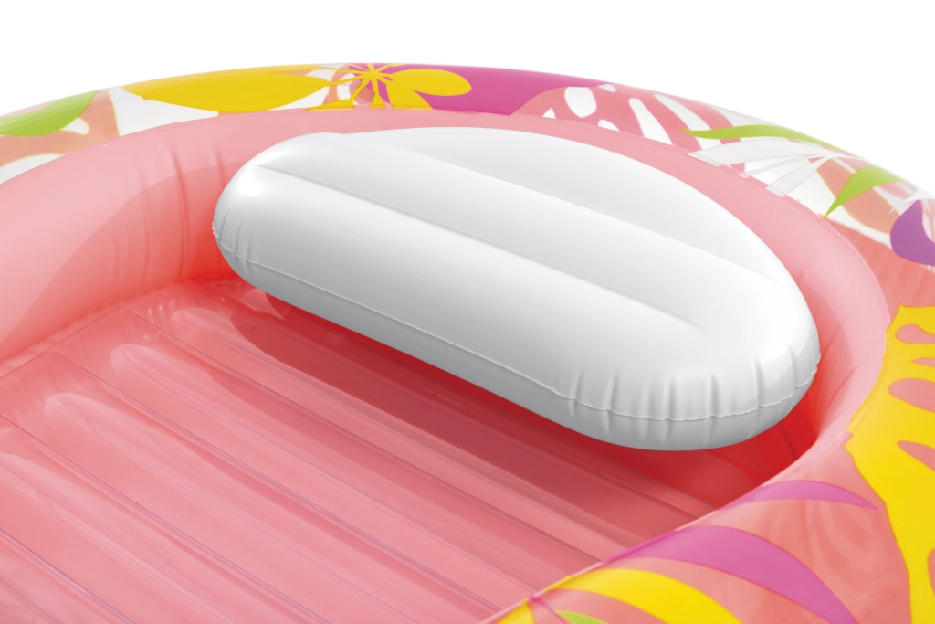 Nafukovací madrac s jastučićem Tropical Oasis dizajniran je za maksimalnu udobnost pri opuštanju na vodi. Povišeni rub, rebraste komore i integrirani bijeli jastučić pružaju potporu tijelu i glavi, dok više zračnih komora osigurava stabilno i sigurno plutanje. Svježi tropski tisak u nijansama ružičaste, zelene, žute i ljubičaste naglašava ljetni ugođaj.