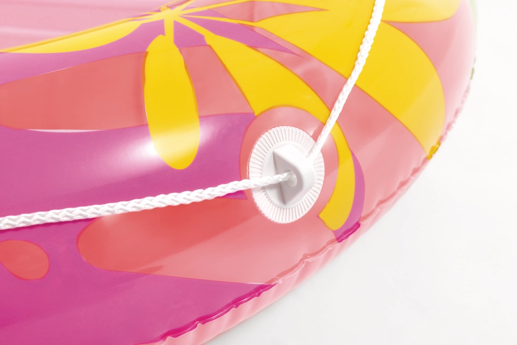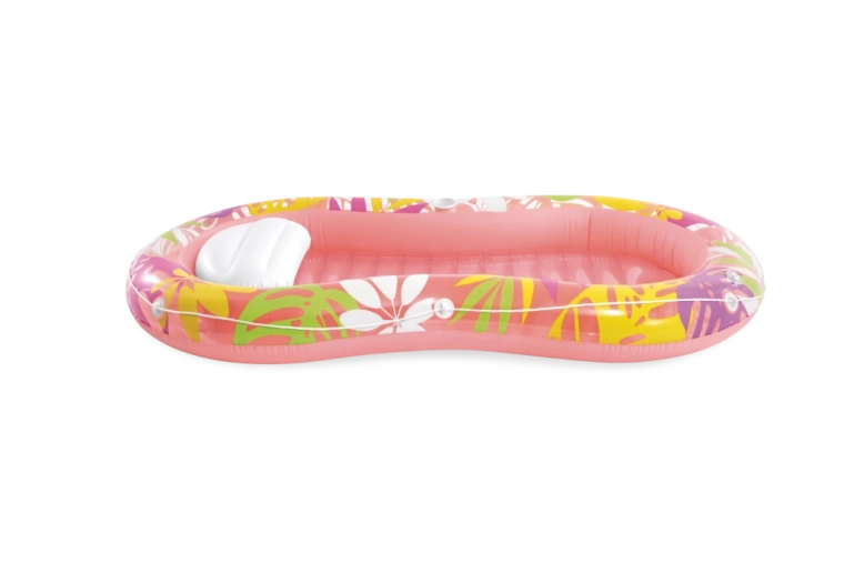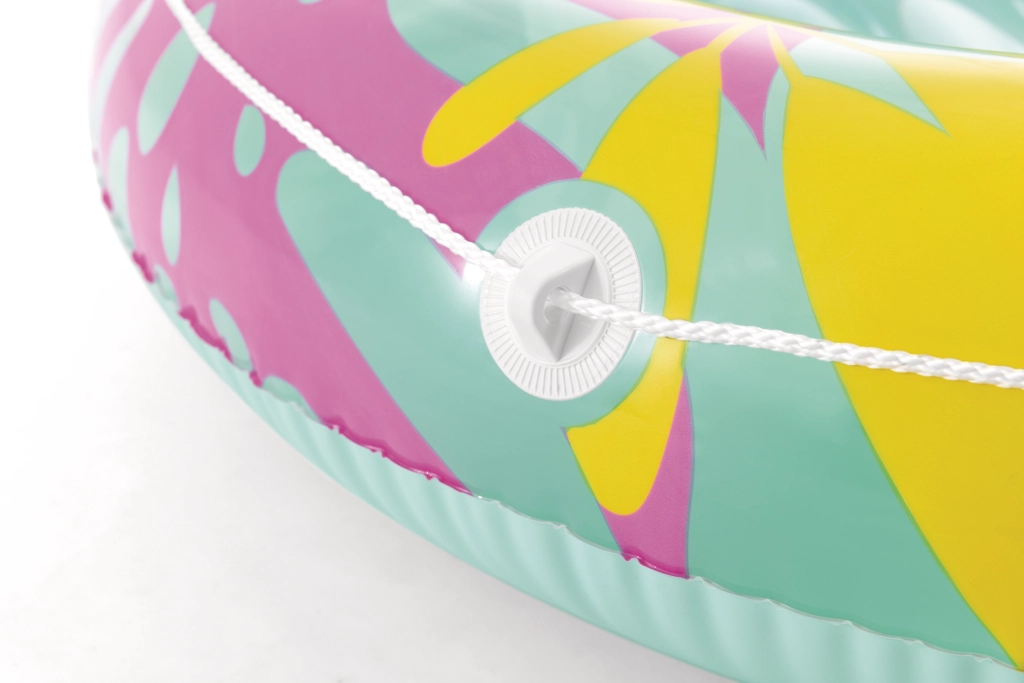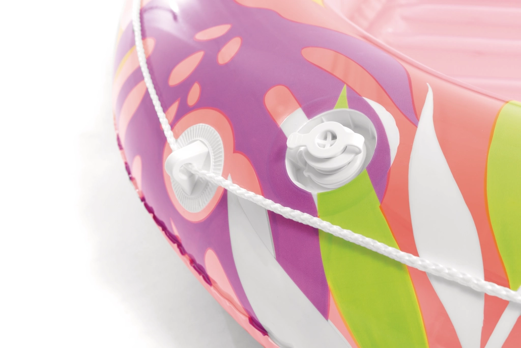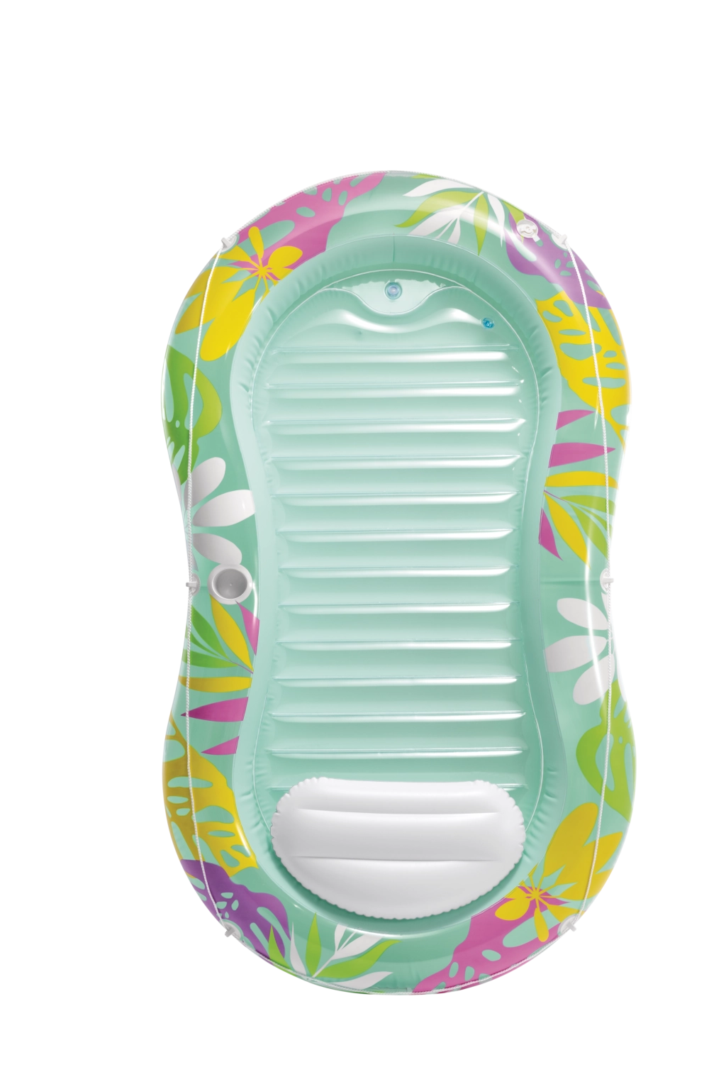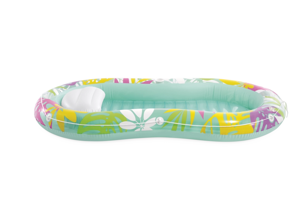 Nafukovací madrac s jastučićem Tropical Oasis dizajniran je za maksimalnu udobnost pri opuštanju na vodi. Povišeni rub, rebraste komore i integrirani bijeli jastučić pružaju potporu tijelu i glavi, dok više zračnih komora osigurava stabilno i sigurno plutanje. Svježi tropski tisak u nijansama ružičaste, zelene, žute i ljubičaste naglašava ljetni ugođaj.