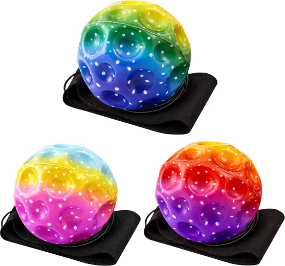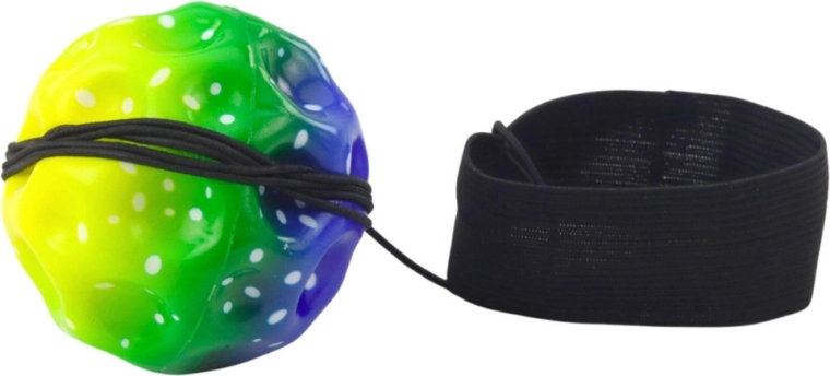 Šarena senzorička loptica na elastičnoj gumici s podesivom narukvicom za sigurnu igru u kući i na otvorenom. Mekana, vrlo lagana i podatna, s jamicastom površinom za stimulaciju dodira. Odlično pomaže trenirati koordinaciju, reflekse i ublažava stres bez brige da će se loptica izgubiti.