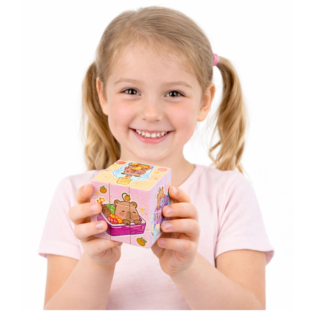 Ova šarena logička kocka s motivom kapibare izvrsna je prva zagonetna igračka za najmlađe. Djeca okretanjem i preklapanjem segmenata slažu na pojedinim stranama simpatične slike te tako prirodno treniraju opažanje i strpljivost. Zahvaljujući glatkim površinama i ugodnoj veličini, kocka se lako drži i motivira na igru iznova i iznova.