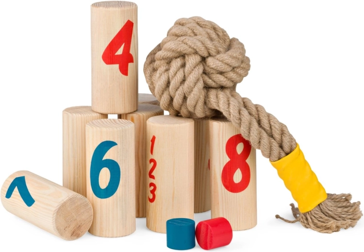 Otkrijte dinamičnu i napetu obiteljsku igru za 2–6 igrača od 8 godina naviše. Pomoću bacačkog čvora obarate numerirane drvene kolčiće i skupljate bodove – pobjeđuje onaj tko prvi postigne točno 30 bodova ili obori sve kolčiće svoje boje. Igra je idealna za vrt i park, potiče grubu motoriku, strateško razmišljanje i aktivnu igru na otvorenom. Drvo potječe iz odgovorno upravljanih šuma.
