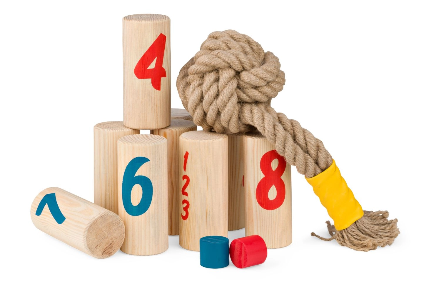 Sadržaj pakiranja: 7 drvenih stupića (14 × 6 × 6 cm), 2 pješaka (3,5 × 3,5 × 3 cm), 1 bacački čvor, tablica za bodovanje.