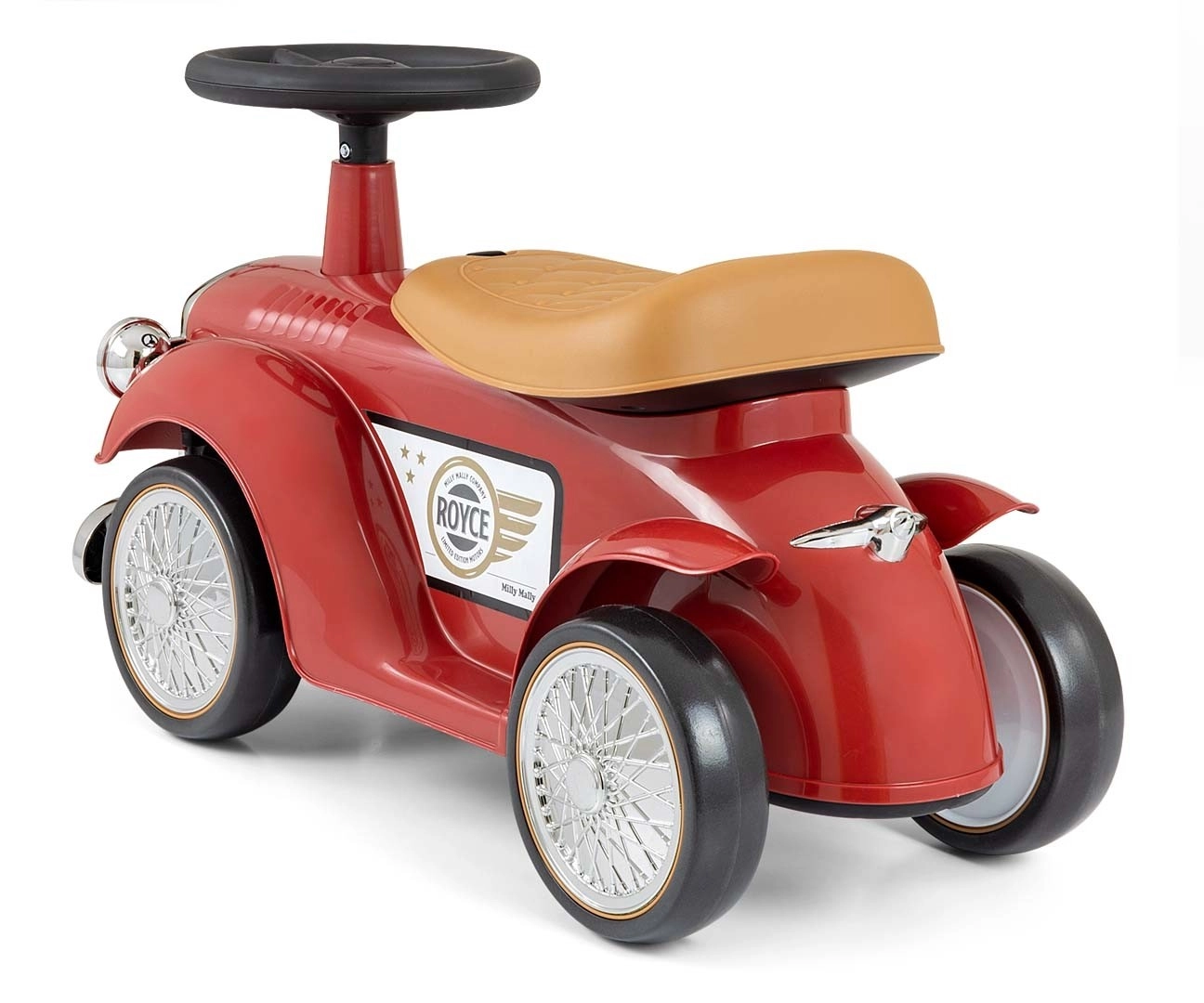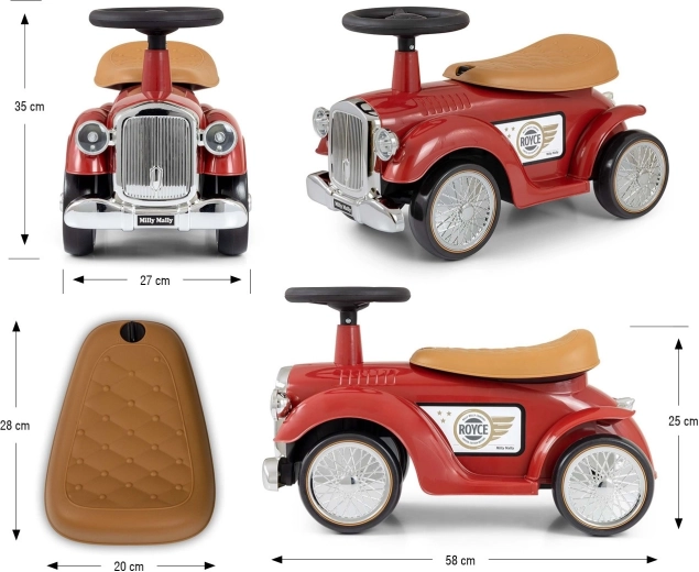 Stilska dječja guralica ROYCE marke Milly Mally u burgundskoj boji donosi retro dizajn, stabilnu konstrukciju i udobno sjedalo. Nudi okretni volan sa sirenom, mekane EVA kotače i pretinac ispod sjedala za igračke. Odlično za razvoj ravnoteže i motorike u domu i na otvorenom.