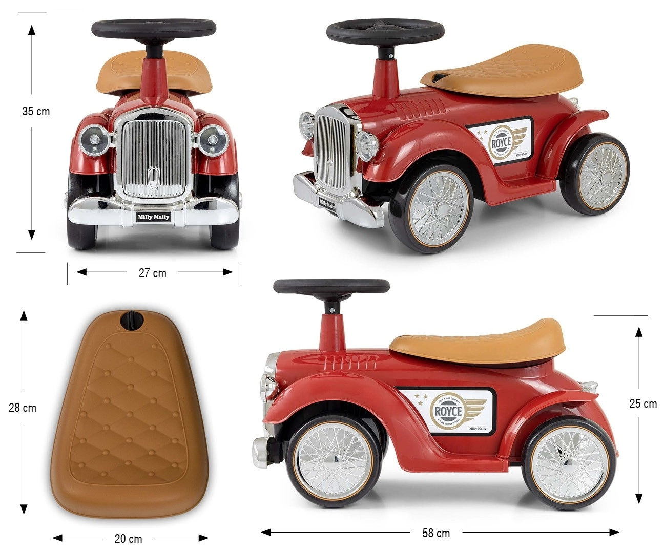 Otkrijte čar klasike s guralicom ROYCE – elegantnim pratiteljem za prve vožnje malih vozača. Laka i izdržljiva plastična konstrukcija, ergonomski oblici i nisko težište osiguravaju sigurnu vožnju. Mekani EVA kotači tihi su, nježni prema podu i dobro ublažavaju neravnine pri vožnji vani.
