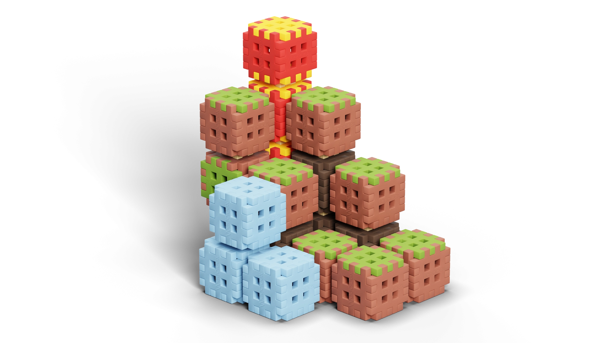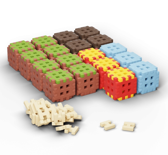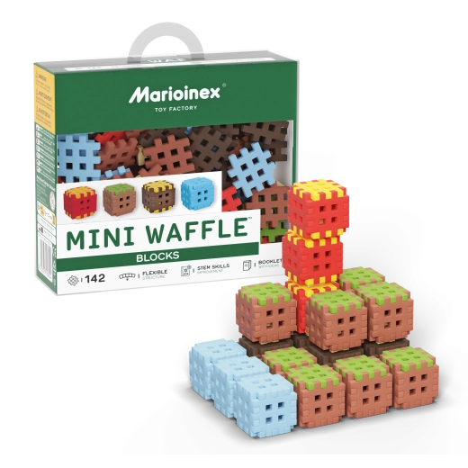 Set za slaganje Mini Waffle Blocks donosi 142 šarena dijela inspirirana prirodom – smeđa „zemlja”, zelena „trava”, ledeno plavi elementi i energični crveno‑žuti akcenti. Zahvaljujući mekanom i elastičnom materijalu kocke su ugodne za držanje i lako se spajaju čak i mlađoj djeci.