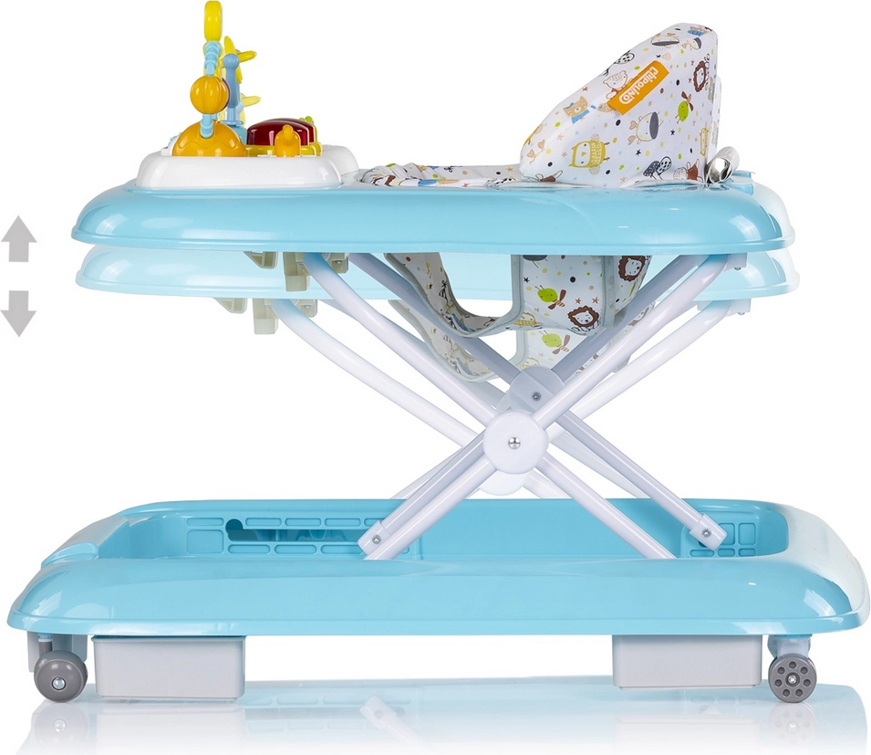 Sigurnost je na prvom mjestu: robusna konstrukcija, 6 protukliznih graničnika i 4 kotačića (prednji se okreću 360°, stražnji dvosmjerni) pružaju stabilnost i gladak pokret po različitim površinama. Hodalica se može lako sklopiti radi uštede prostora i praktičnog prenošenja. Za glazbene i svjetlosne funkcije dovoljno je umetnuti 2× AA 1,5 V baterije (nisu uključene). Proizvod je u skladu s europskom normom EN 1273.
